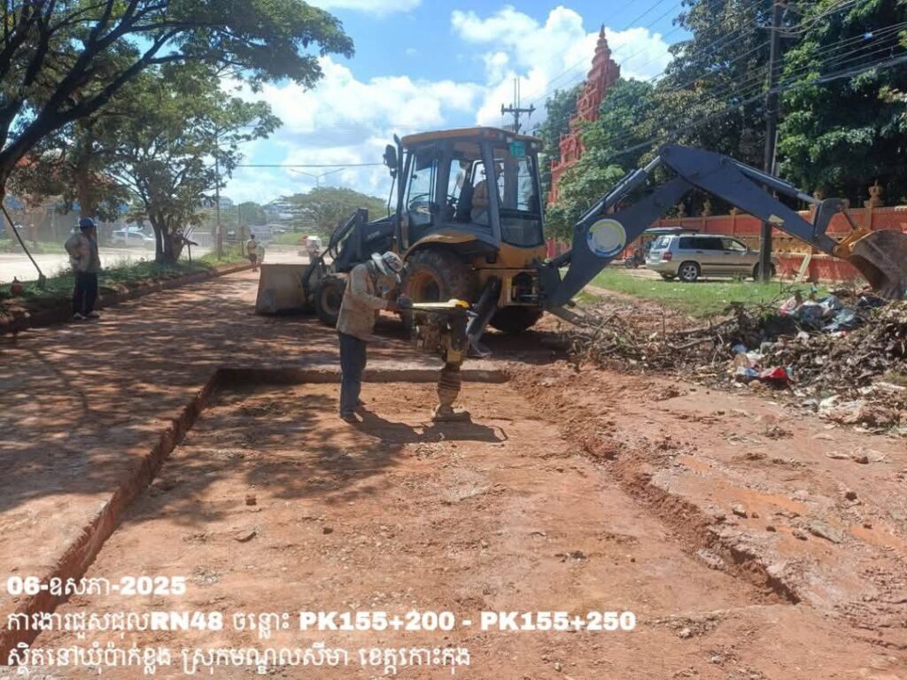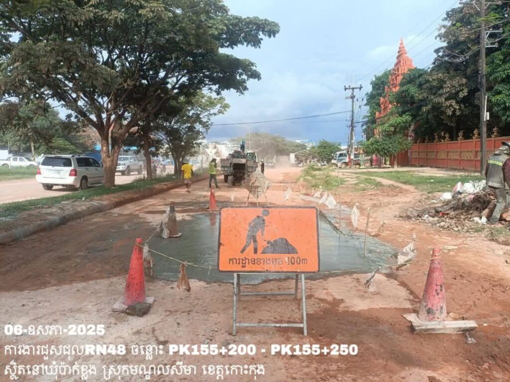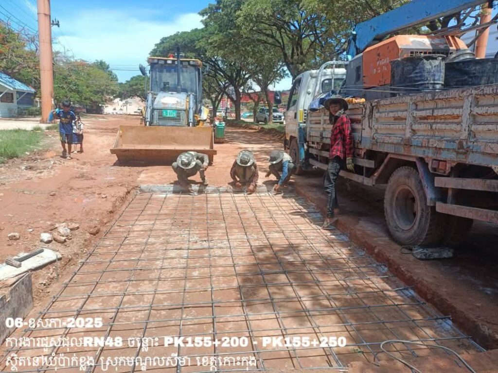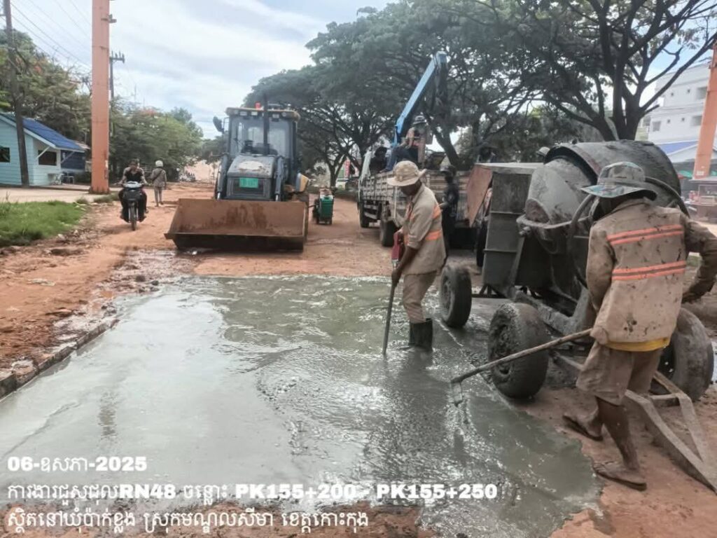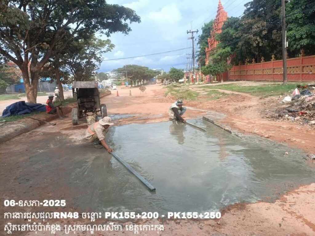 -បន្តថែទាំប្រចាំលើផ្លូវជាតិលេខ48 ឃុំប៉ាក់ខ្លង ស្រុកមណ្ឌលសីមា ខេត្តកោះកុង ការងារធ្វើគ្រឹះ រួចចាក់បេតុងសរសៃដែកជួសជុលសំបុកមាន់ ត្រង់ចន្លោះ PK155+200 – PK155+250។