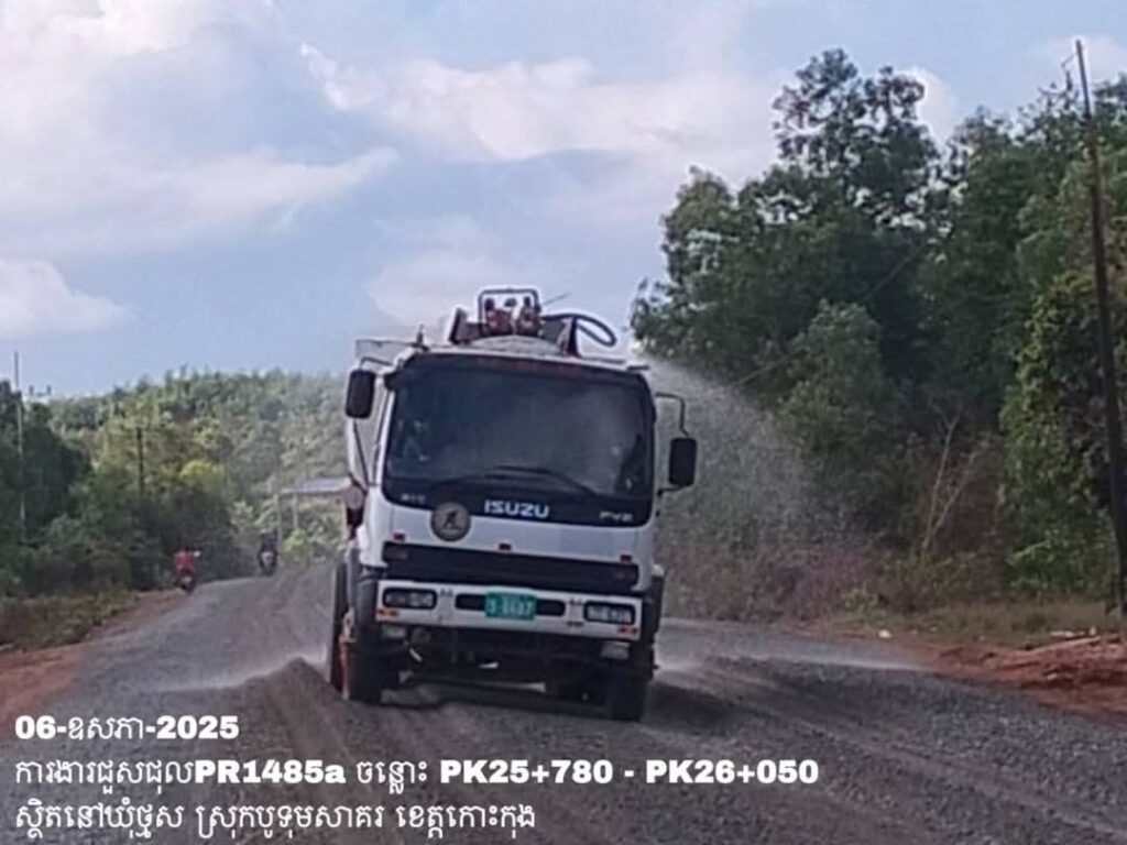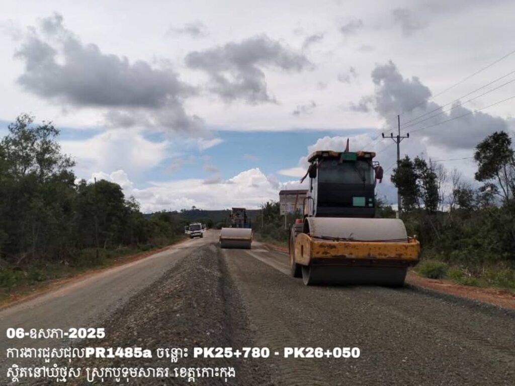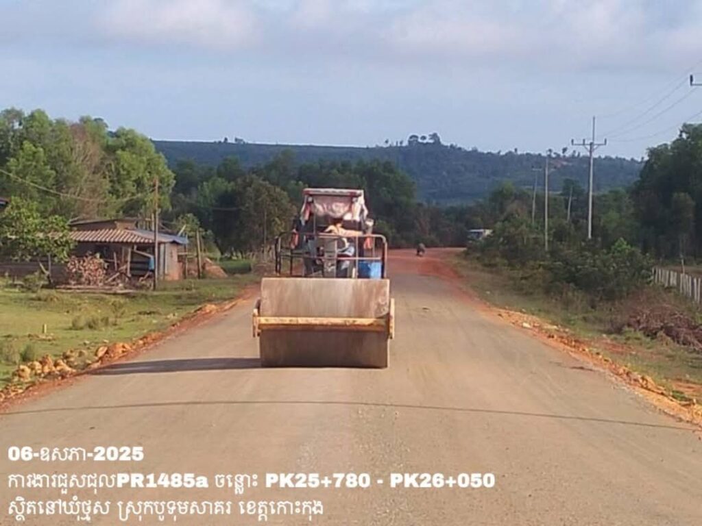 -បន្តថែទាំខួបលើផ្លូវខេត្តលេខ1485a ឃុំថ្មស ស្រុកបូទុមសាគរ ខេត្តកោះកុង ការងារចាក់ល្បាយថ្មម៉ិច M30 រួចកៀរ កិន បង្ហាប់ ធ្វើគ្រឹះសំខាន់ ត្រង់ចន្លោះ PK25+780 – PK26+050។