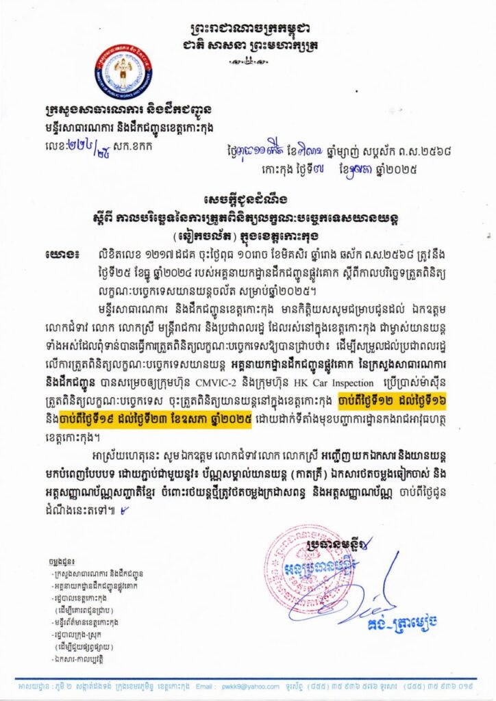 មន្ទីរសាធារណការ និងដឹកជញ្ជូនខេត្តកោះកុង សូមជូនដំណឹង ស្តីពីឆៀកចល័តតាមខេត្ត នឹងដំណើរការនៅខេត្តកោះកុងចាប់ពីថ្ងៃទី១២ ដល់ ១៦ និងថ្ងៃទី១៩ ដល់២៣ ខែឧសភា ឆ្នាំ២០២៥