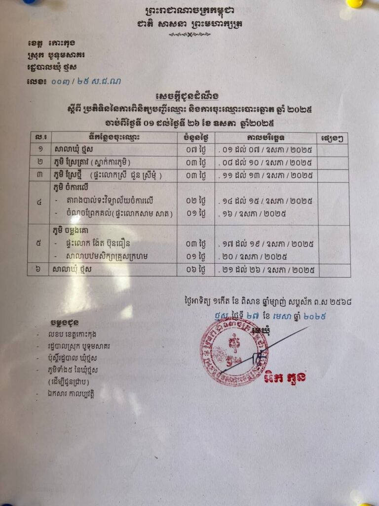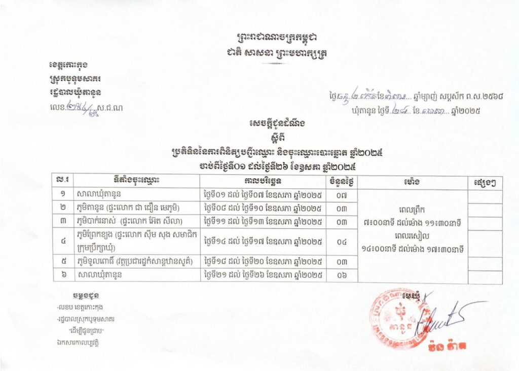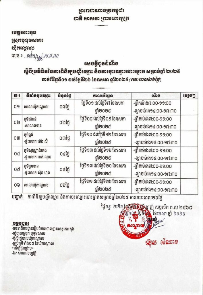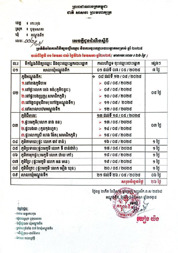 រដ្ឋបាលស្រុកបូទុមសាគរ សូមគោរពជម្រាបជូនដល់បងប្អូនប្រជាពលរដ្ឋដែលរស់នៅក្នុងមូលដ្ឋានស្រុកបូទុមសាគរ មេត្តាជ្រាបថា៖ ការពិនិត្យបញ្ជីឈ្មោះ និងការចុះឈ្មោះបោះឆ្នោត ឆ្នាំ២០២៥ ដែលមានរយៈពេល២១ថ្ងៃ ចាប់ពីថ្ងៃទី១ ដល់ថ្ងៃទី២៦ ខែឧសភា ឆ្នាំ២០២៥៖