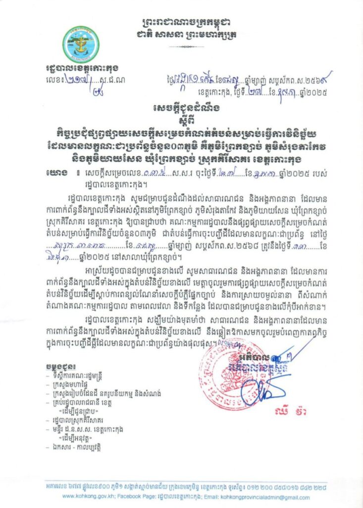 សេចក្តីជូនដំណឹង ស្តីពីកិច្ចប្រជុំផ្សព្វផ្សាយសេចក្តីសម្រេចកំណត់តំបន់សម្រាប់ធ្វើការវិនិច្ឆ័យ ដែលមានលក្ខណៈជាប្រព័ន្ធចំនួន០៣ភូមិ គឺភូមិព្រែកខ្សាច់ ភូមិសំរុងតាកែវ និងភូមិយាយសែន ឃុំព្រែកខ្សាច់ ស្រុកគិរីសាគរ ខេត្តកោះកុង