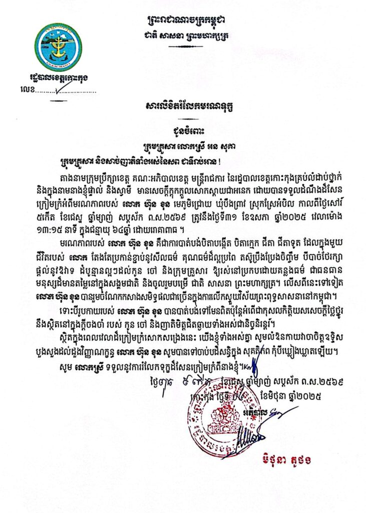 សារលិខិតរំលែកមរណទុក្ខ ជូនចំពោះ លោកស្រី អន សុគា និងក្រុមគ្រួសារ ព្រមទាំងសាច់ញាតិទាំងស់ នៃសព