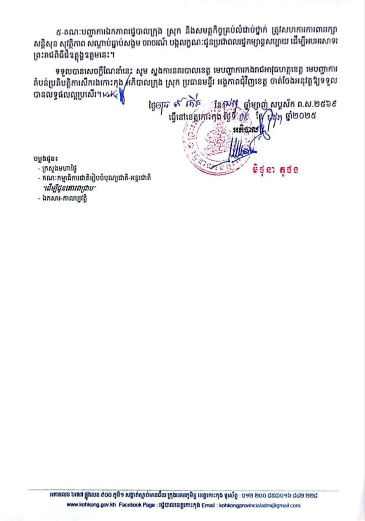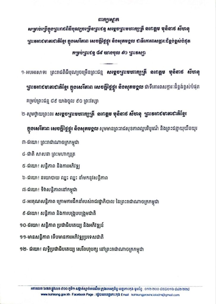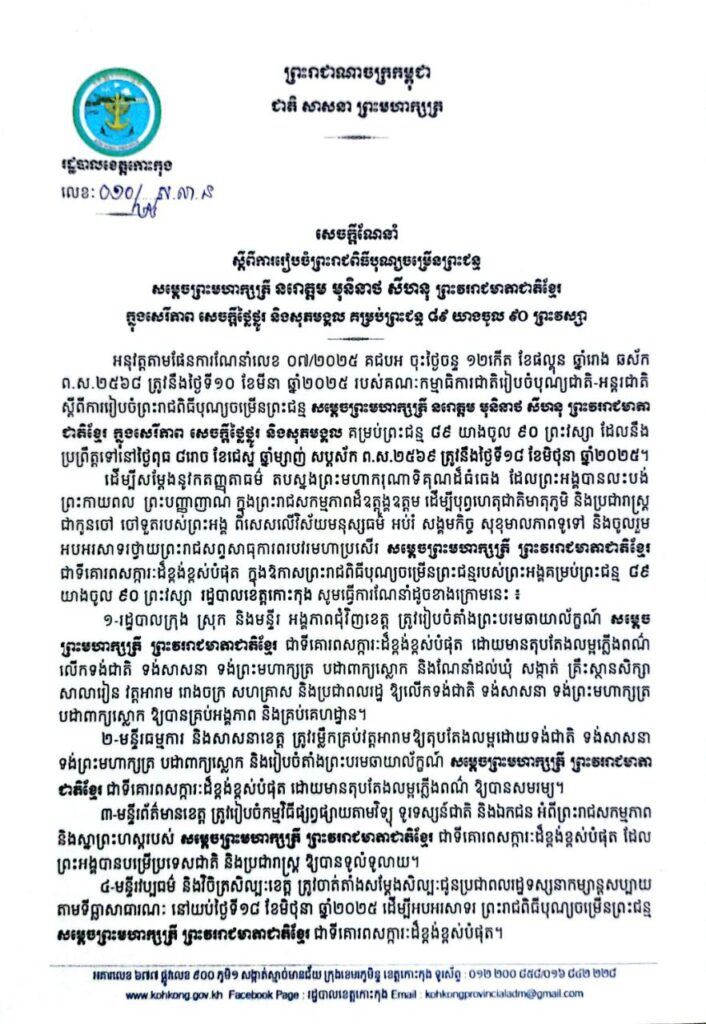 សេចក្តីណែនាំ ស្តីពីការរៀបចំព្រះរាជពិធីបុណ្យចម្រើនព្រះជន្ម សម្តេចព្រះមហាក្សត្រី នរោត្តម មុនិនាថ សីហនុ ព្រះវររាជមាតាជាតិខ្មែរ ក្នុងសេរីភាព សេចក្តីថ្លៃថ្នូរ និងសុភមង្គល គម្រប់ព្រះជន្ម ៨៩ យាងចូល ៩០ ព្រះវស្សា