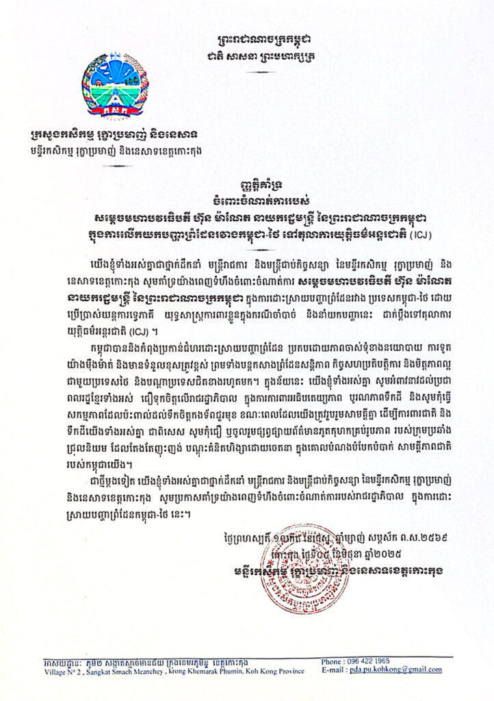 ញ្ញត្តិគាំទ្រ របស់មន្ទីរកសិកម្ម រុក្ខាប្រមាញ់ និងនេសាទខេត្តកោះកុង ចំពោះចំណាត់ការរបស់ សម្តេចមហាបវរធិបតី ហ៊ុន ម៉ាណែត នាយករដ្ឋមន្ត្រី នៃព្រះរាជាណាចក្រកម្ពុជា ក្នុងការដោះស្រាយបញ្ហាព្រំដែនរវាងកម្ពុជា-ថៃក្នុងសមាជរដ្ឋសភា-ព្រឹទ្ធសភា នៅវិមានរដ្ឋសភា ថ្ងៃទី០២ ខែមិថុនា ឆ្នាំ២០២៥។