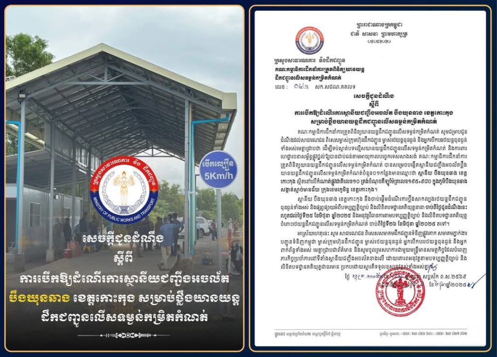 គណ:កម្មាធិការដឹកនាំការត្រួតពិនិត្យយានយន្តដឹកជញ្ជូនលើសទម្ងន់កម្រិតកំណត់ សូមជម្រាបជូនដំណឹងដល់សាធារណជន ពិសេសម្ចាស់ក្រុមហ៊ុនដឹកជញ្ជូន ម្ចាស់រថយន្តធុនធ្ងន់ និងអ្នកបើកបររថយន្តធុនធ្ងន់ ទាំងអស់មេត្តាជ្រាបថា ដើម្បីទប់ស្កាត់បទល្មើសយានយន្តដឹកជញ្ជូនលើសទម្ងន់កម្រិតកំណត់ និងការពារហេដ្ឋារចនាសម្ព័ន្ធផ្លូវថ្នល់ឱ្យបានជាប់ធន់តាមអាយុកាលបច្ចេកទេសសាងសង់ គណៈកម្មាធិការដឹកនាំការត្រួតពិនិត្យយានយន្តដឹកជញ្ជូនលើសទម្ងន់កម្រិតកំណត់ បានសម្រេចបង្កើតស្ថានីយជញ្ជីងអចល័តថ្លឹងយានយន្តដឹកជញ្ជូនលើសទម្ងន់កម្រិតកំណត់ចំនួន ០១ កន្លែង មានឈ្មោះថា ស្ថានីយ បឹងឃុនឆាង ខេត្តកោះកុង ស្ថិតនៅលើកំណាត់ផ្លូវជាតិលេខ១០ ត្រង់ចំណុចគីឡូម៉ែត្រលេខ ១៩៥+៩៨០ ក្នុងភូមិបឹងឃុនឆាង សង្កាត់ស្មាច់មានជ័យ ក្រុងខេមរភូមិន្ទ ខេត្តកោះកុង។