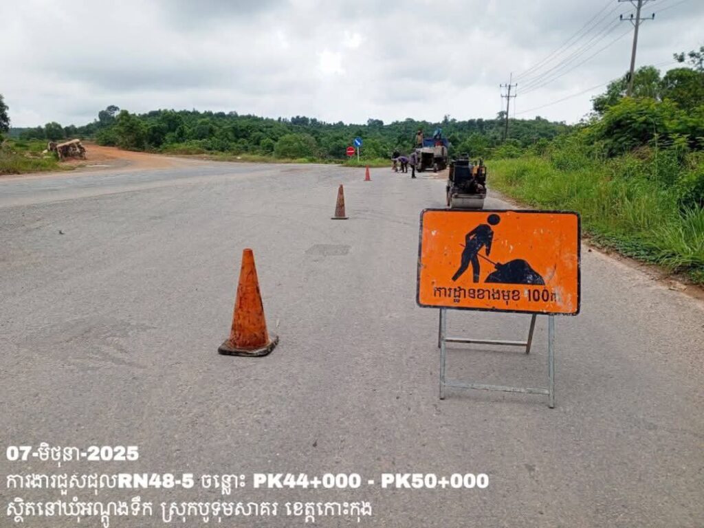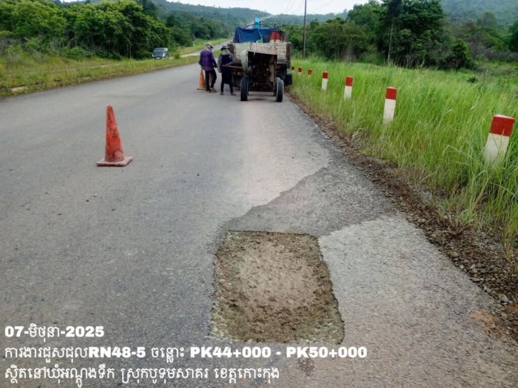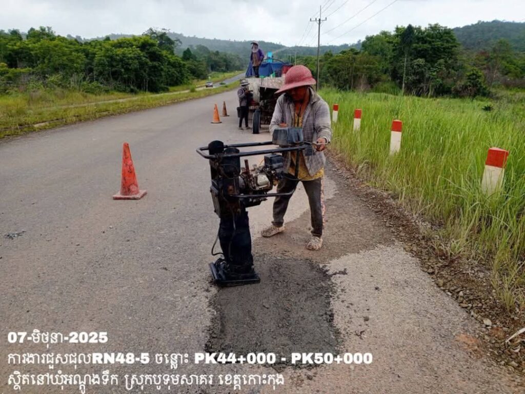 -បន្តការងារថែទាំប្រចាំលើផ្លូវជាតិលេខ 48-5 ឃុំអណ្ដូងទឹក ស្រុកបូទុមសាគរ ខេត្តកោះកុង សកម្មភាពការងារ ជួសជុលសំបុកមាន់ ដោយប្រើល្បាយថ្មម៉ិច ជាមួយស៊ីម៉ង់ត៍ និងកៅស៊ូ CRS-2 ត្រង់ចន្លោះ PK44+000 – PK50+000។