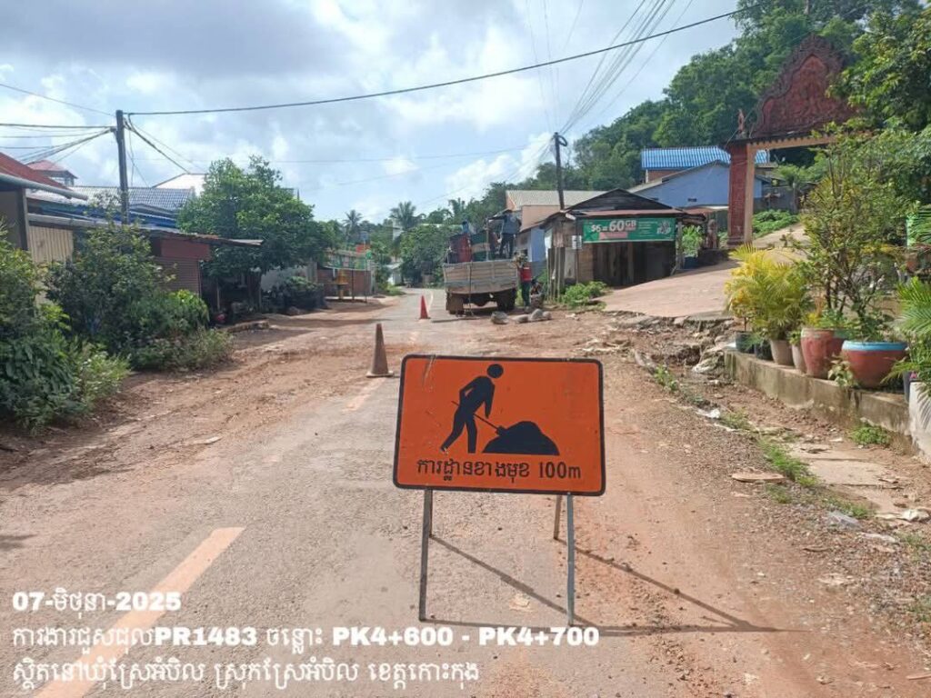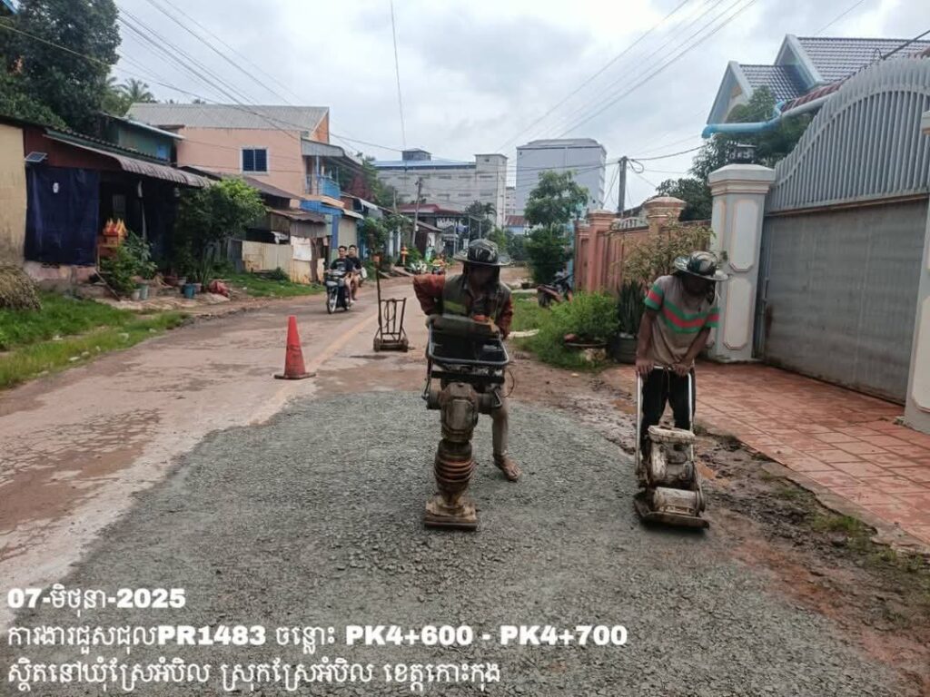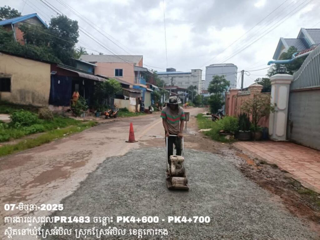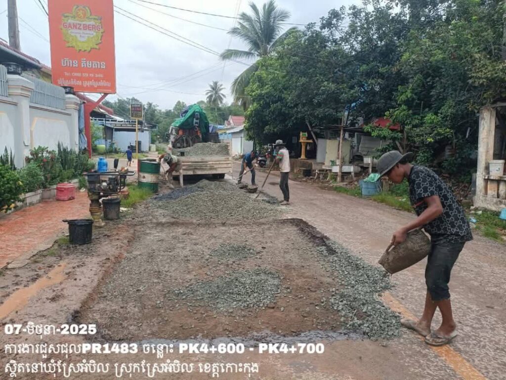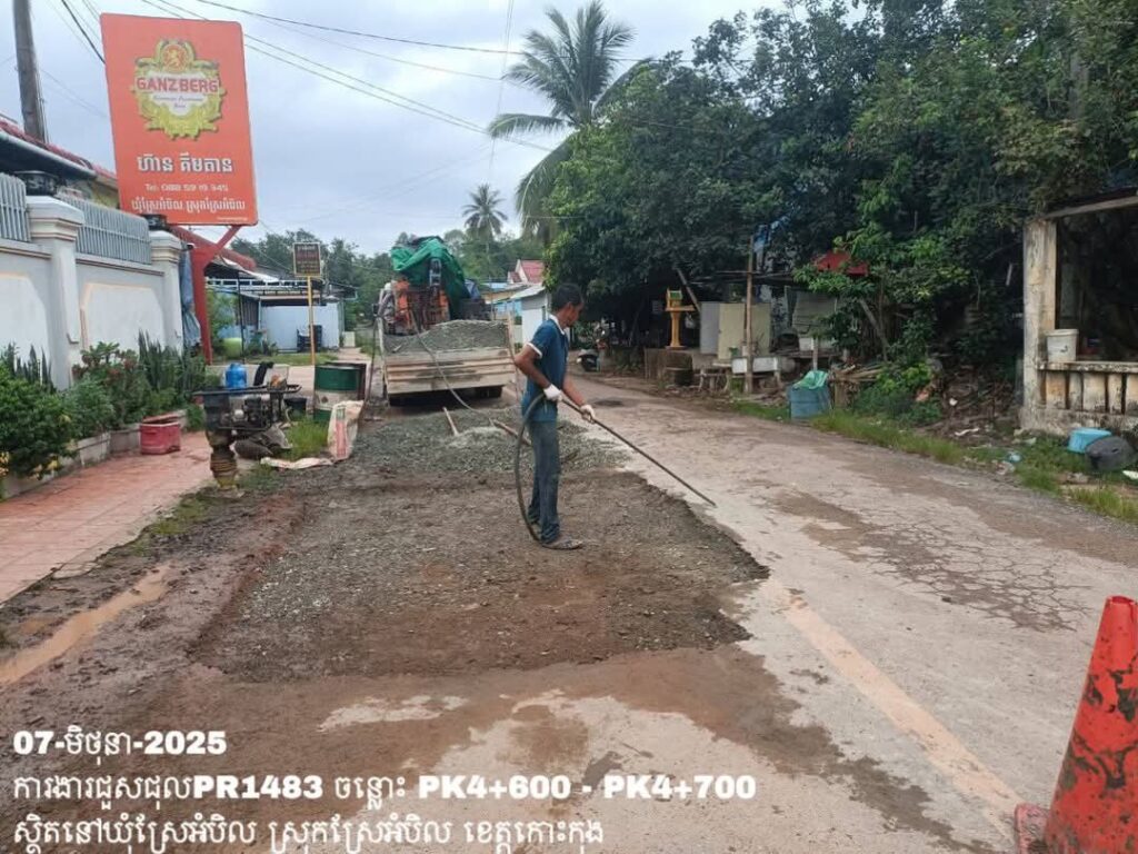-បន្តការងារថែទាំប្រចាំលើផ្លូវខេត្តលេខ1483 ឃុំស្រែអំបិល ស្រុកស្រែអំបិល ខេត្តកោះកុង សកម្មភាពការងារ ជួសជុលសំបុកមាន់ ដោយប្រើល្បាយថ្មម៉ិច ជាមួយស៊ីម៉ង់ត៍ និងកៅស៊ូ CRS-2 ត្រង់ចន្លោះ PK4+600 – PK4+700។