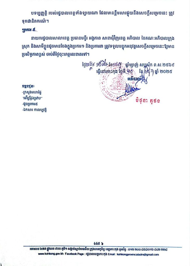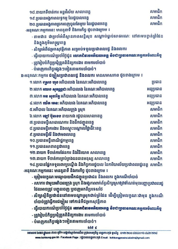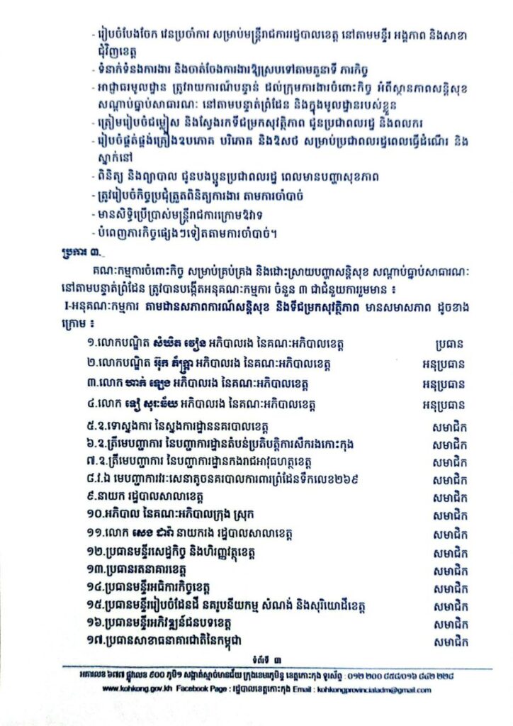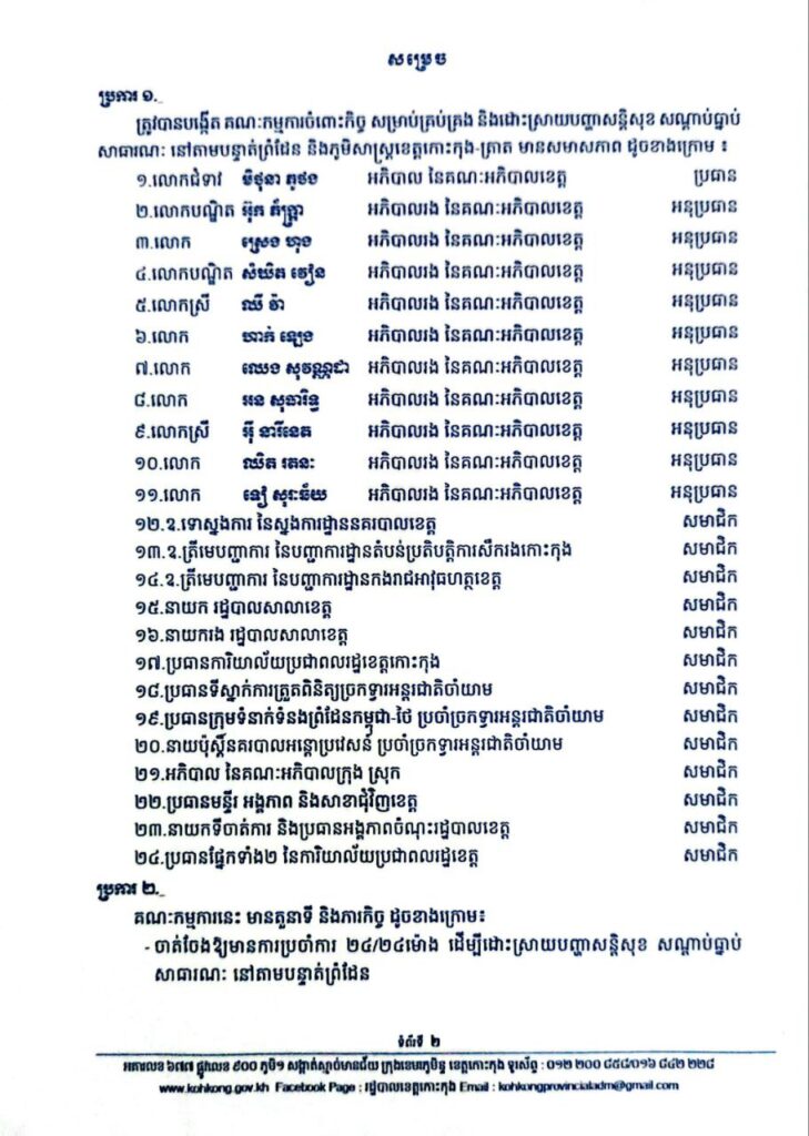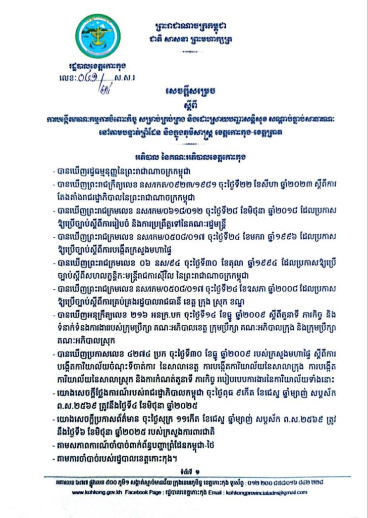សេចក្តីសម្រេច ស្តីពីការបង្កើតគណៈកម្មការបំពោះកិច្ច សម្រាប់គ្រប់គ្រង និងដោះស្រាយបញ្ហាសន្តិសុខ សណ្តាប់ធ្នាប់សាធារណៈ នៅតាមបន្ទាត់ព្រំដែន និងក្នុងភូមិសាស្ត្រខេត្តកោះកុង-ខេត្តត្រាត