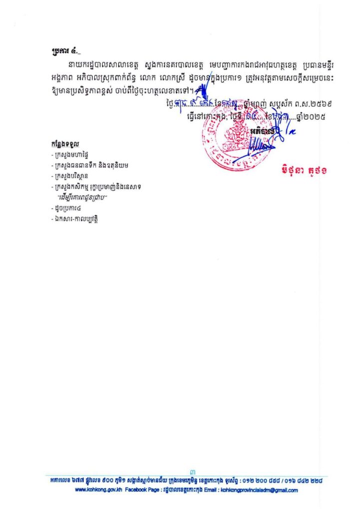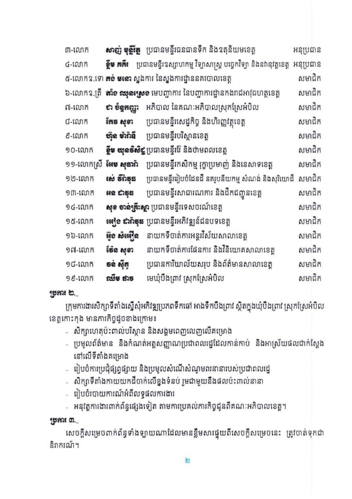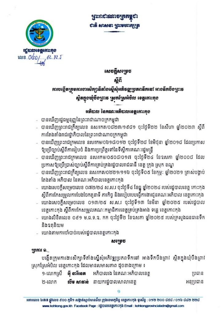 សេចក្តីសម្រេច ស្តីពីការបង្កើតក្រុមការងារសិក្សាទីតាំងស្នើសុំអភិវឌ្ឍប្រភពទឹកនៅ អាងទឹកបឹងព្រាវ ស្ថិតក្នុងឃុំបឹងព្រាវ ស្រុកស្រែអំបិល ខេត្តកោះកុង