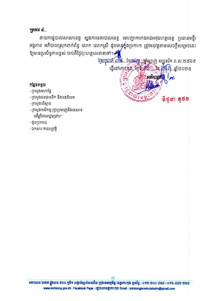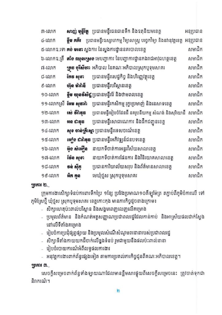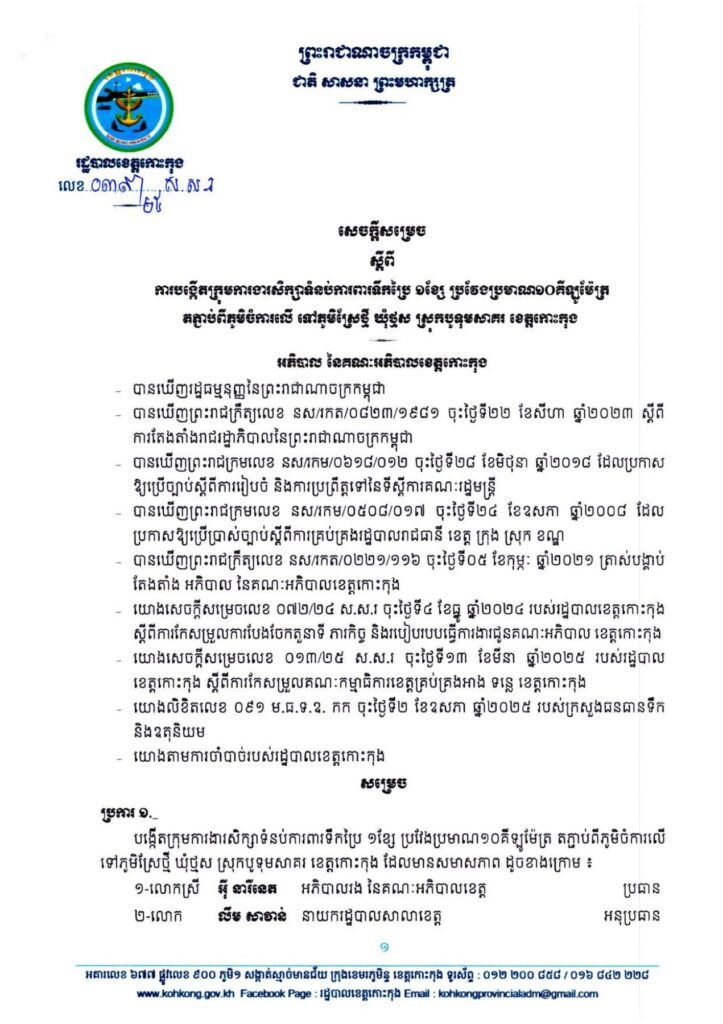 សេចក្តីសម្រេច ស្តីពីការបង្កើតក្រុមការងារសិក្សាទំនប់ការពារទឹកប្រៃ ១ខ្សែ ប្រវែងប្រមាណ១០គីឡូម៉ែត្រ តភ្ជាប់ពីភូមិចំការលើ ទៅភូមិស្រែថ្មី ឃុំថ្មស ស្រុកបូទុមសាគរ ខេត្តកោះកុង