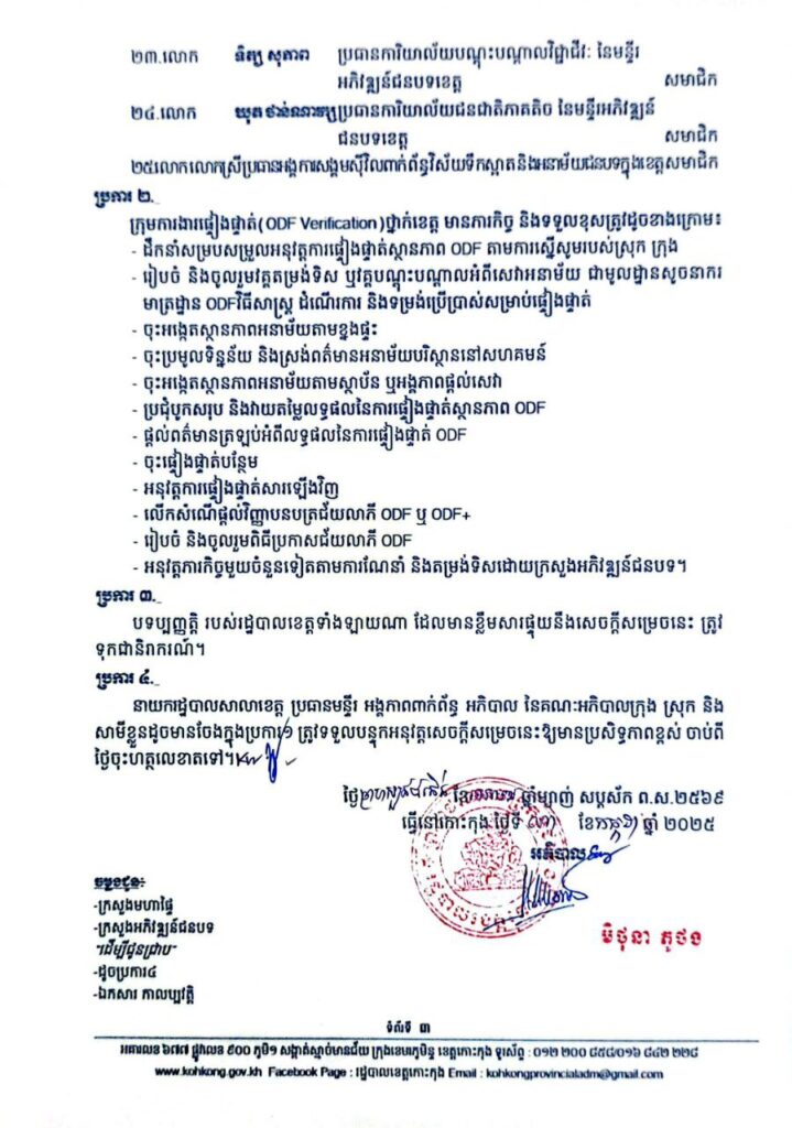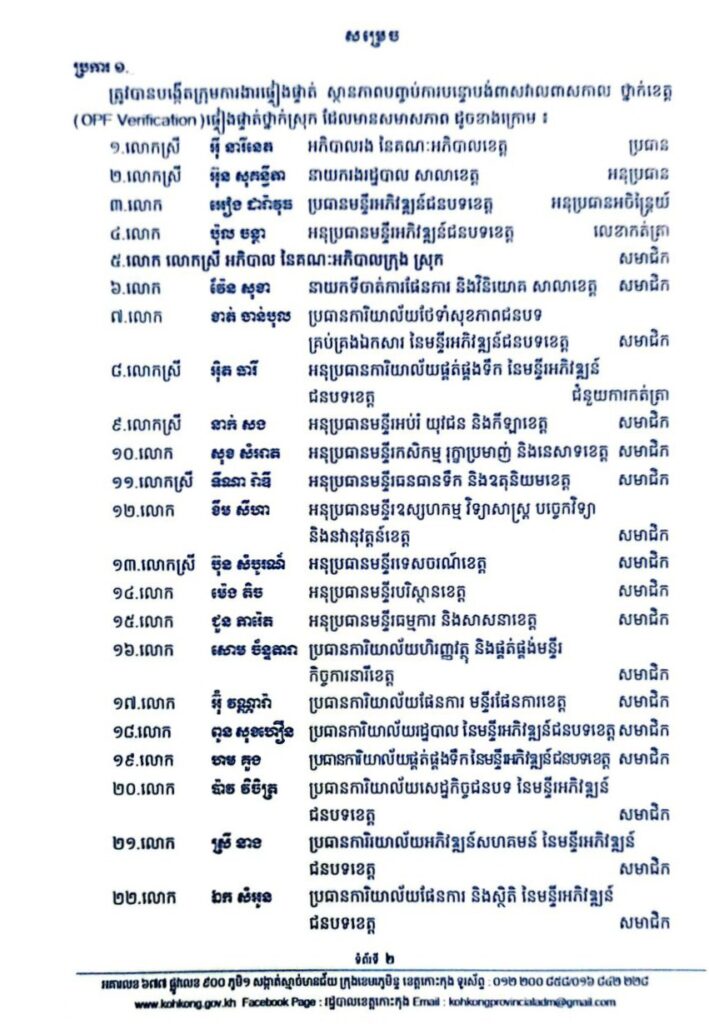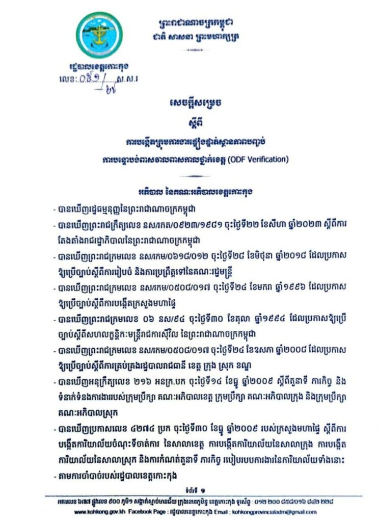 សេចក្តីសម្រេច ស្តីពីការបង្កើតក្រុមការងារផ្ទៀងផ្ទាត់ស្ថានភាពបញ្ចប់ការបន្ទោបង់ពាសវាលពាសកាលថ្នាក់ខេត្ត (ODF Verification)