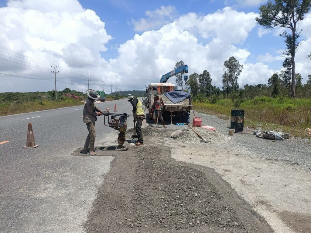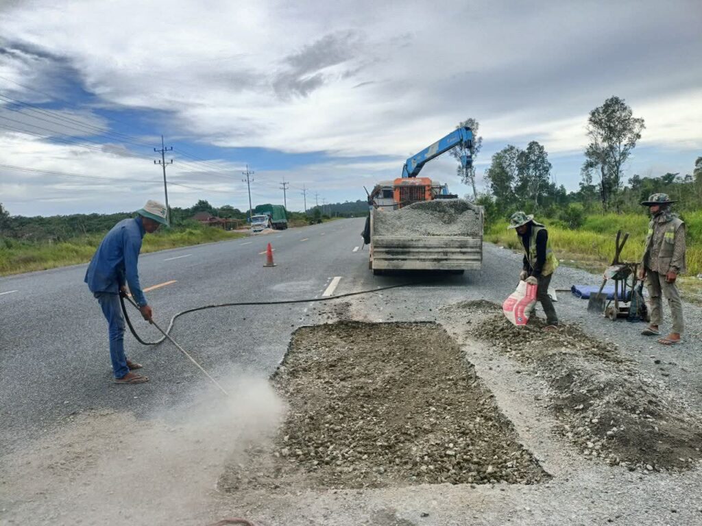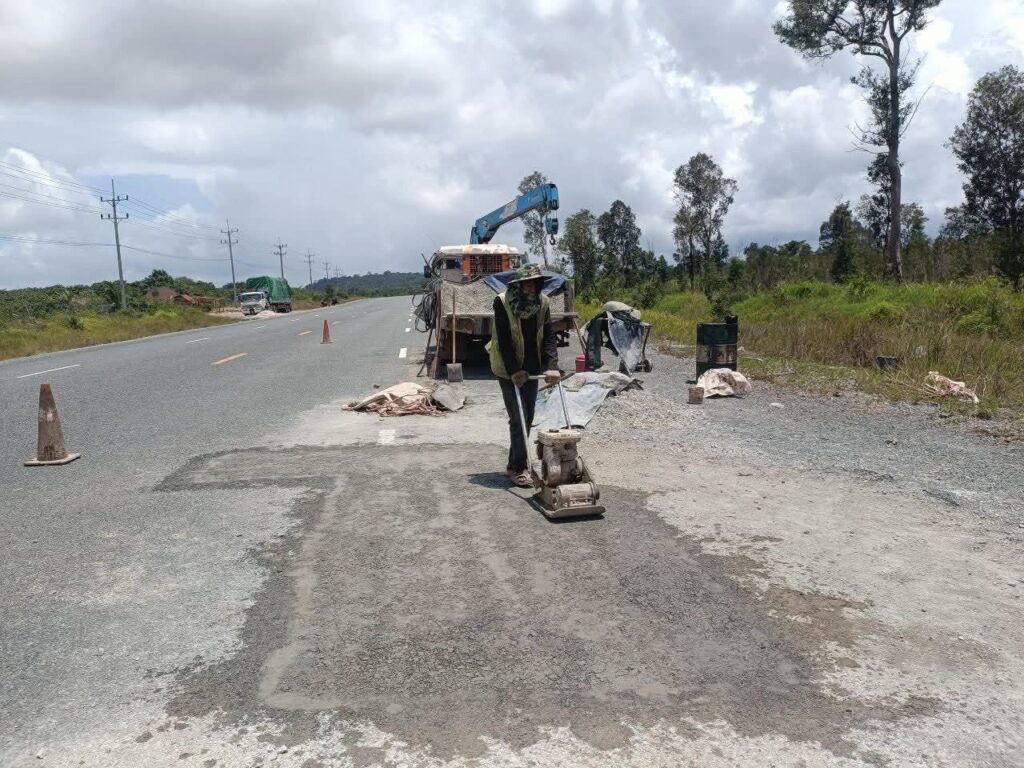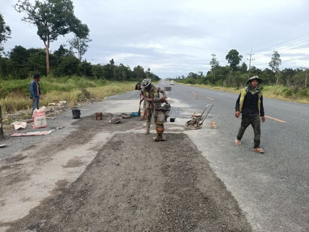 -បន្តការងារថែទាំប្រចាំលើផ្លូវជាតិលេខ 48-5 ឃុំអណ្ដូងទឹក ស្រុកបូទុមសាគរ ខេត្តកោះកុង សកម្មភាពការងារ ជួសជុលសំបុកមាន់ ដោយប្រើល្បាយថ្មម៉ិច ជាមួយស៊ីម៉ង់ត៍ និងកៅស៊ូ CRS-2 ត្រង់ចន្លោះ PK14+100 – PK14+200។