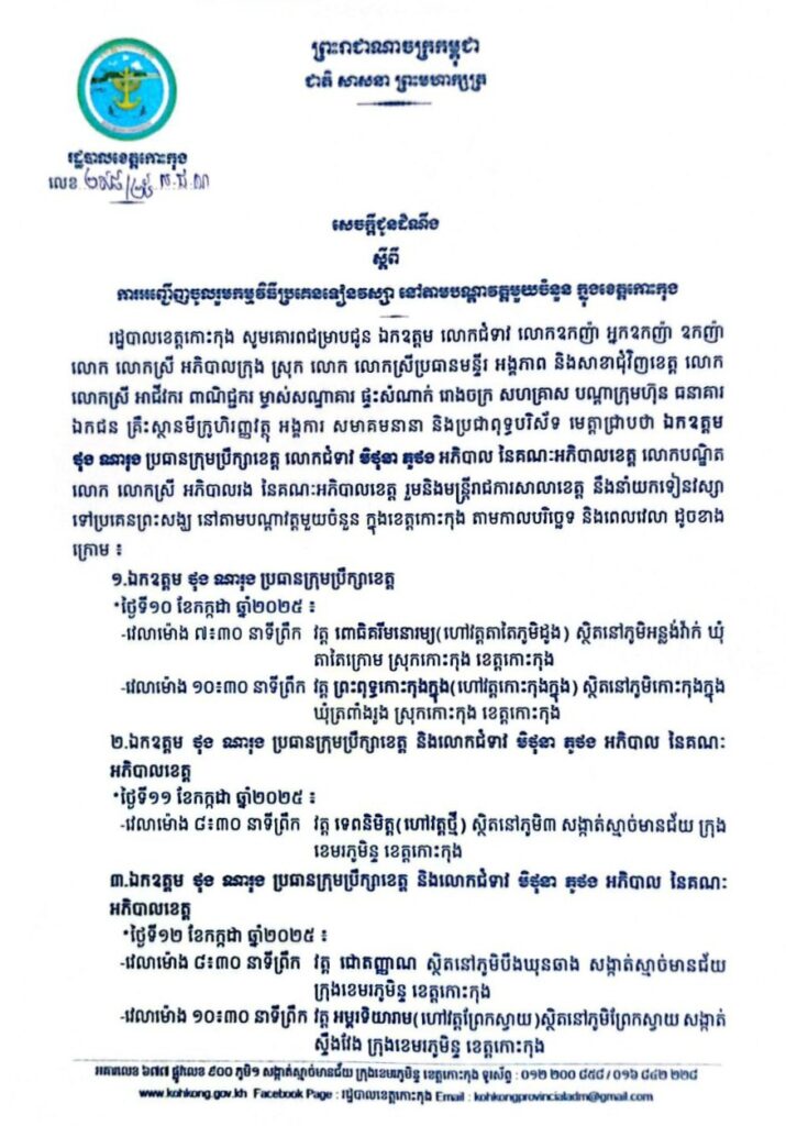 សេចក្តីជូនដំណឹង ស្តីពីការអញ្ជើញចូលរួមកម្មវិធីប្រគេនទៀនវស្សា នៅតាមបណ្តាវត្តមួយចំនួន ក្នុងខេត្តកោះកុង