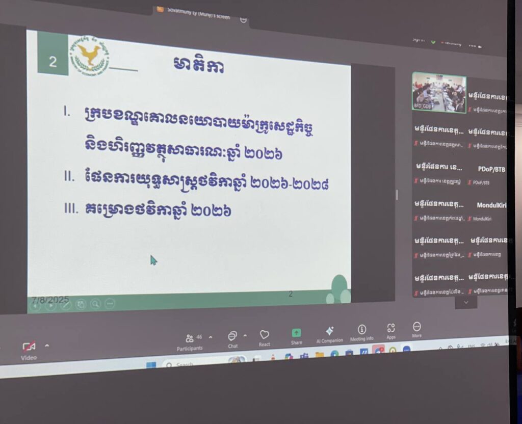 លោក ជា ស៊ីវត្រា ប្រធានមន្ទីរផែនការខេត្តកោះកុង ដឹកនាំសហការី ៣រូប ចូលរួមកិច្ចប្រជុំពិភាក្សាកម្រិតបច្ចេកទេសជាមួយក្រុមការងារថវិការបស់ក្រសួងផែនការ និងមន្ទីរផែនការរាជធានី-ខេត្ត ស្តីពីការរៀបចំគម្រោងផែនការចំណាយថវិកាឆ្នាំ ២០២៦ តាមរយៈប្រព័ន្ធzoom នៅសាលប្រជុំមន្ទីរផែនការខេត្តកោះកុង។កិច្ចប្រជុំនេះមានគោលបំណង ការពិនិត្យលើផែនការយុទ្ធសាស្ត្រថវិកាឆ្នាំ២០២៦-២០២៨ ការពិនិត្យគម្រោងថវិកា២០២៦ និងការស្នើឡើងបន្ថែម។