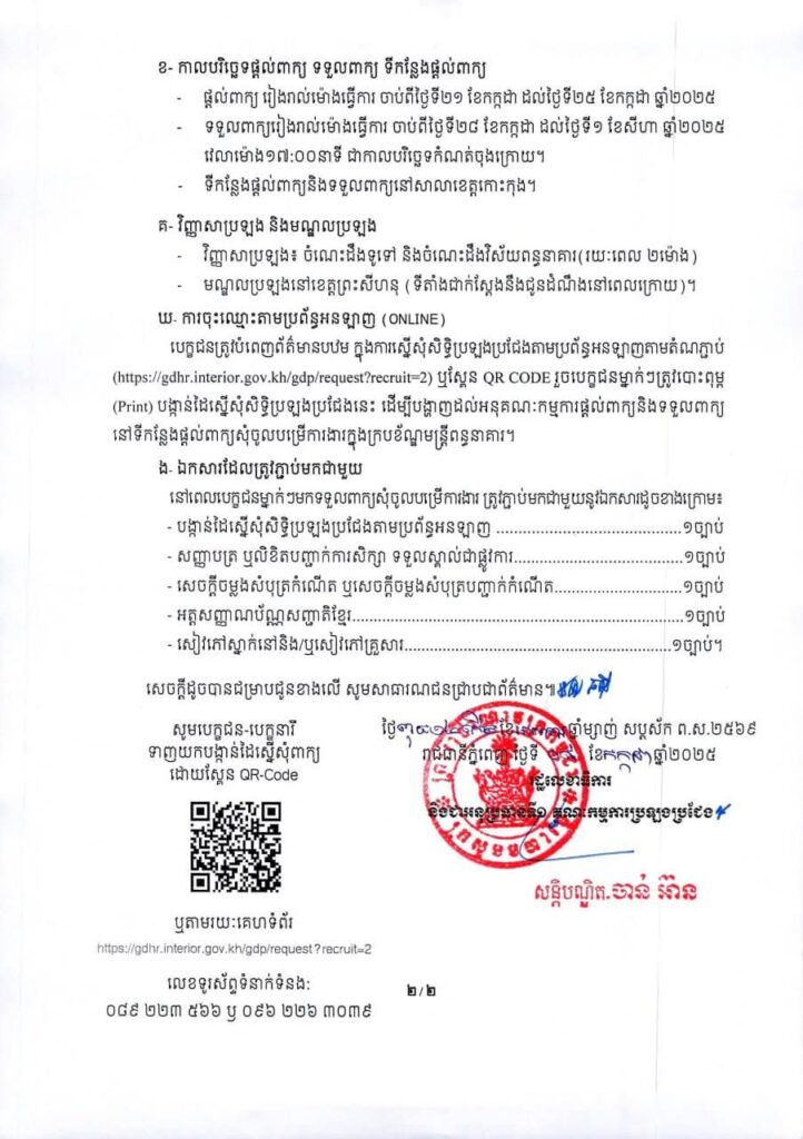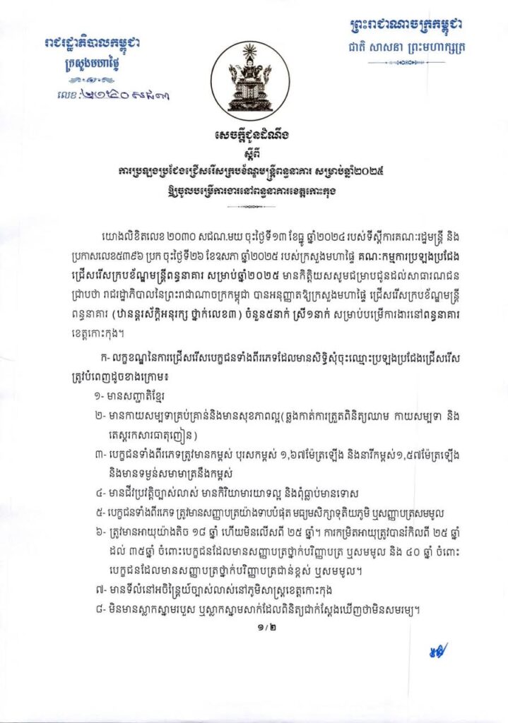 សេចក្តីជូនដំណឹង ស្តីពីការប្រឡងប្រជែងជ្រើសរើសក្របខ័ណ្ឌមន្ត្រីពន្ធនាគារ សម្រាប់ឆ្នាំ២០២៥ ឱ្យចូលបម្រើការងារនៅពន្ធនាគារខេត្តកោះកុង