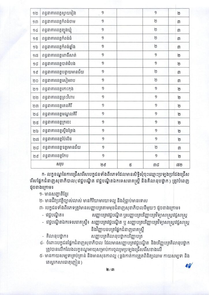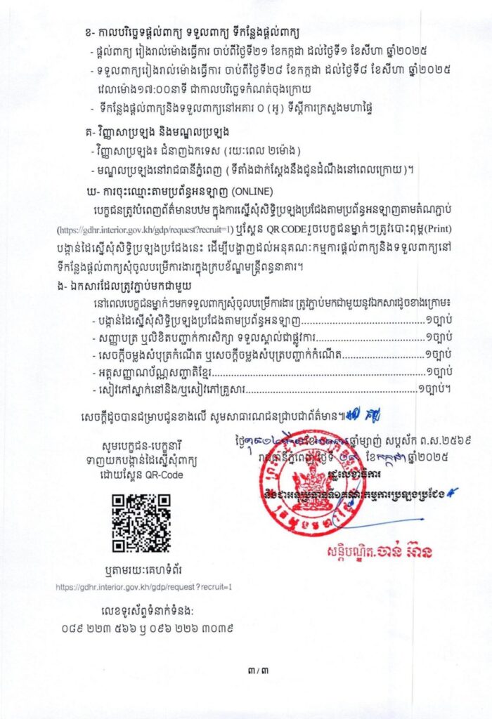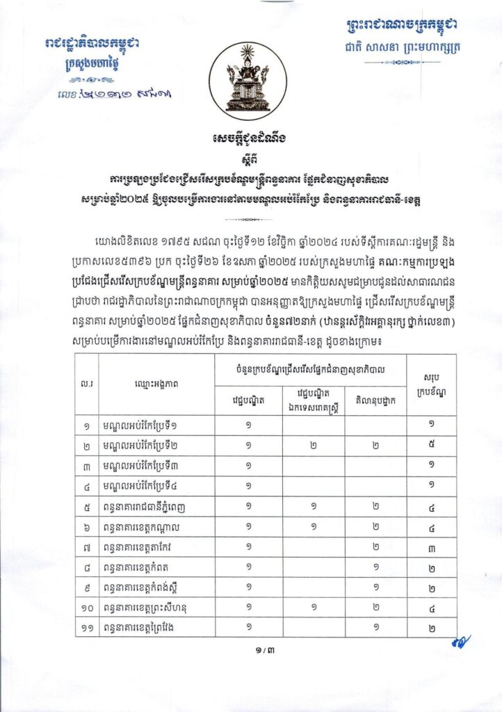 សេចក្តីជូនដំណឹង ស្តីពីការប្រឡងប្រជែងជ្រើសរើសក្របខ័ណ្ឌមន្ត្រីពន្ធនាគារ ផ្នែកជំនាញសុខាភិបាល សម្រាប់ឆ្នាំ២០២៥ ឱ្យចូលបម្រើការងារនៅតាមមណ្ឌលអប់រំកែប្រែ និងពន្ធនាគាររាជធានី-ខេត្ត