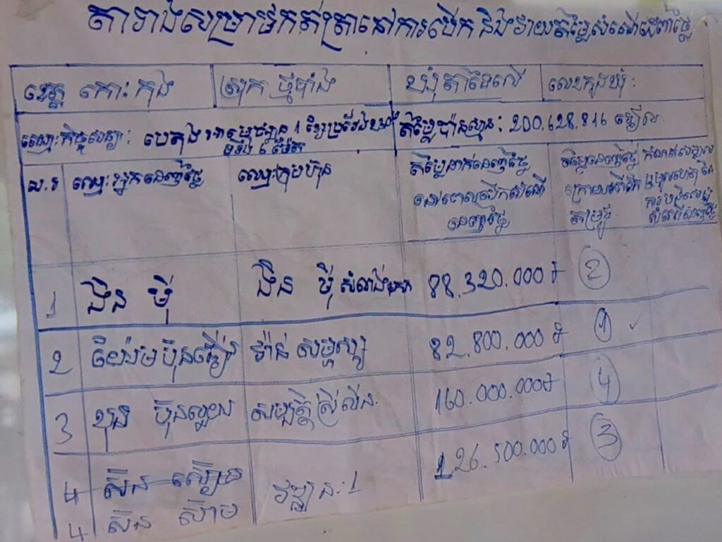 លោក ប៊ុត បឿន ប្រធានការិយាល័យផែនការ និងគាំទ្រឃុំស្រុកថ្មបាំង បានចូលរួមកិច្ចប្រជុំដេញថ្លៃគម្រោងសាងសង់ផ្លូវបេតុងអាមេប្រវែង២៣០ម៉ែត្រ ទទឹង៦ម៉ែត្រ តម្លៃប៉ាន់ស្មាន២០០.៦២៨.៨១៦៛ មូលនិធិឃុំតាទៃលើ ឆ្នាំ២០២៥ ដែលមានសមាសភាពអញ្ជើញចូលរួម ១.គណៈកម្មការលទ្ធកម្មឃុំ ២.មន្រ្តីបច្ចេកទេសខេត្ត ស្រុក ៣.មេភូមិ អនុភូមិ ៤.ក្រុមហ៊ុនដេញថ្លៃ ៥.អ្នកសារព័ត៌មានក/ក្រុមហ៊ុនចូលរួមដេញថ្លៃ ១.ក្រុមហ៊ុន ងីន ម៉ី 82.320.000៛ ២.ក្រុមហ៊ុន វ៉ាន់ សម្ផស្ស 82.800.000៛ ៣.ក្រុមហ៊ុន សម្បត្តិ ស្រីលីន 160.000.000៛ ៤.ក្រុមហ៊ុន វឌ្ឍនៈ 126.500.000៛ ជាលទ្ធផល គណៈកម្មការលទ្ធកម្មសម្រេចយក ១.ក្រុមហ៊ុន វ៉ាន់ សម្ផស្ស 82.800.000៛ ដែលប្រព្រឹត្តទៅនៅសាលាឃុំតាទៃលើ ស្រុកថ្មបាំង ខេត្តកោះកុង។