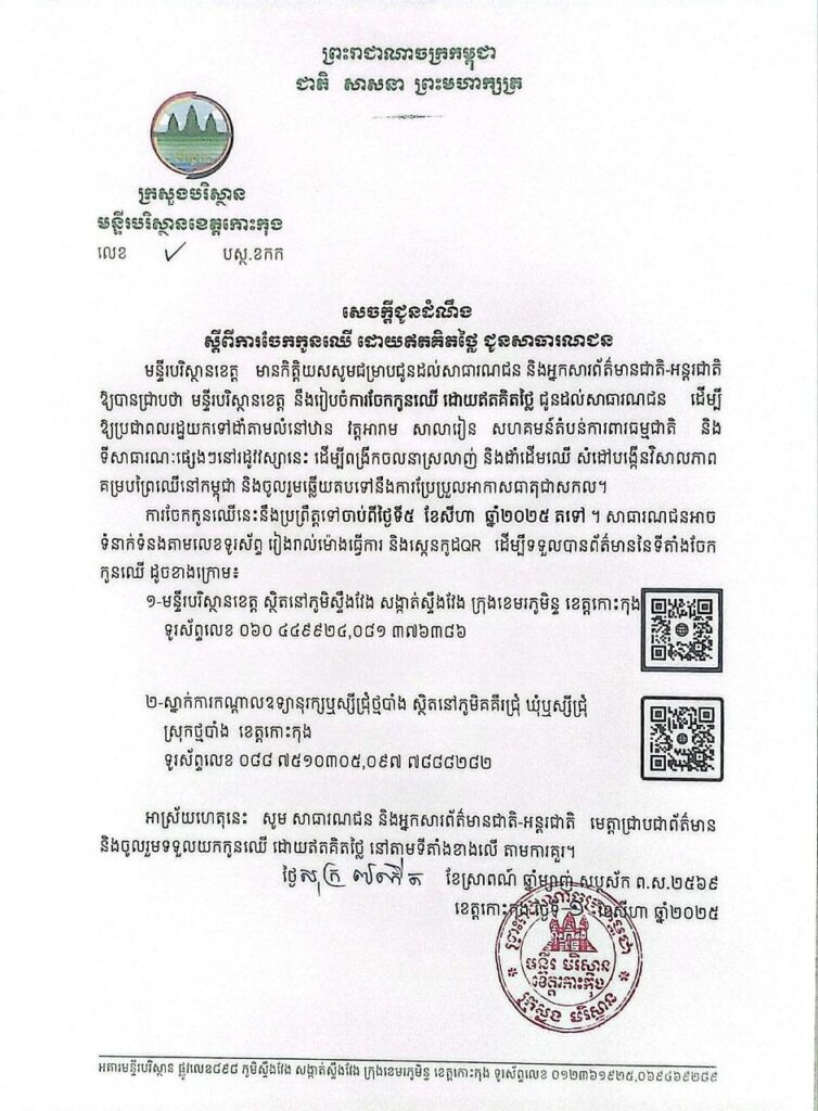 សេចក្តីជូនដំណឹង ស្តីពីការចែកកូនឈើ ដោយឥតគិតថ្លៃ ជូនសាធារណជន