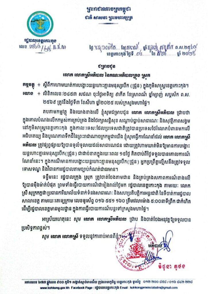 សេចក្តីជូនដំណឹង ស្តីពីការហាមឃាត់ការបង្ហោះយន្តហោះគ្មានមនុស្សបើក (ដ្រូន) ក្នុងភូមិសាស្ត្រខេត្តកោះកុង