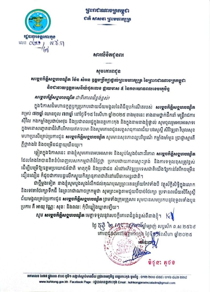 សារលិខិតជូនពរ សូមគោរពជូនសម្តេចកិត្តិសង្គហបណ្ឌិត ម៉ែន សំអន ឧត្តមប្រឹក្សាផ្ទាល់ព្រះមហាក្សត្រ នៃព្រះរាជាណាចក្រកម្ពុជា និងជានាយឧត្តមសេនីយ៍ផុតលេខ ផ្កាយមាស ៥ នៃកងយោធពលខេមរភូមិន្ទ