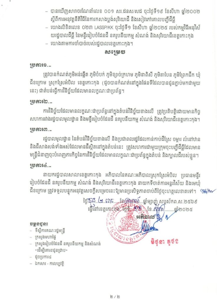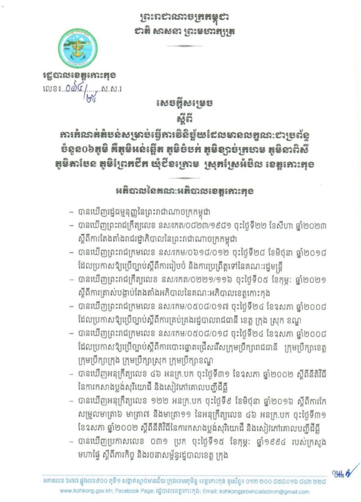 សេចក្តីសម្រេច ស្តីពីការកំណត់តំបន់សម្រាប់ធ្វើការវិនិច្ឆ័យដែលមានលក្ខណៈជាប្រព័ន្ធ ចំនួន០៦ភូមិ គឺភូមិអន់ឆើត ភូមិចំបក់ ភូមិខ្សាច់ក្រហម ភូមិនាពិសី ភូមិតាបែន ភូមិព្រែកជីក ឃុំជីខក្រោម ស្រុកស្រែអំបិល ខេត្តកោះកុង