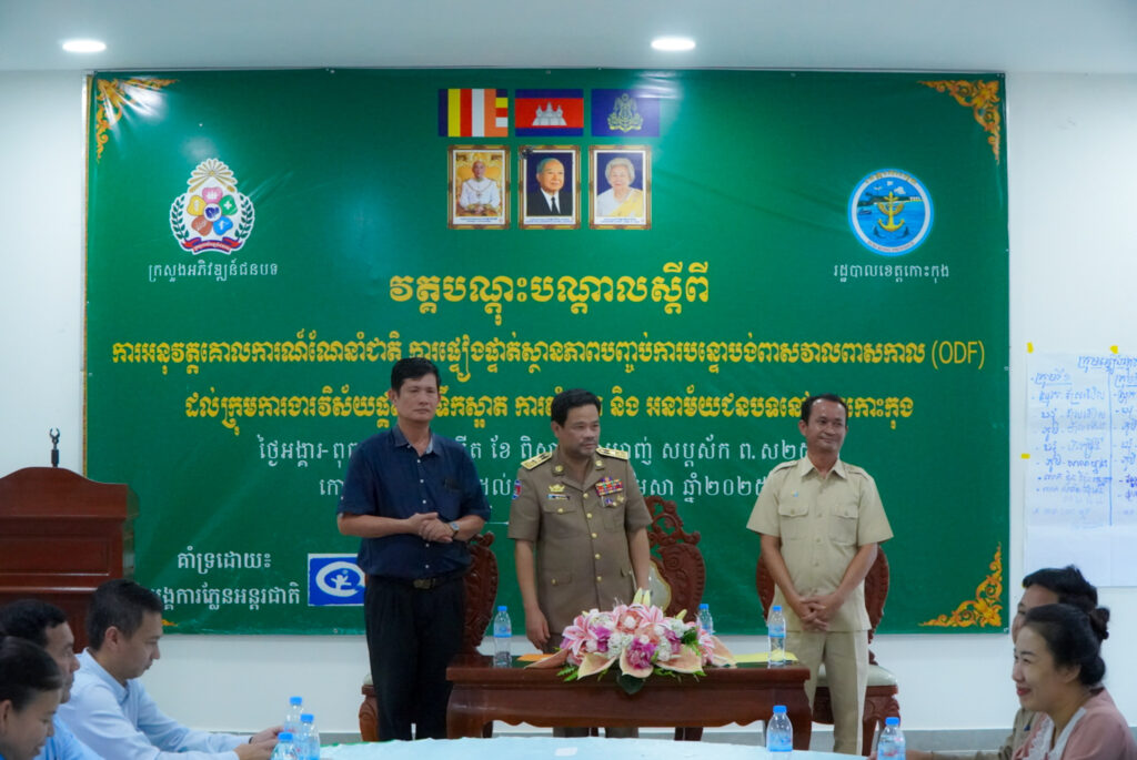 លោកអភិបាលរងខេត្ត បានលើកឡើងថា ខ្ញុំសូមសម្តែងនូវអំណរគុណ និងសូមស្វាគមន៍យ៉ាងកក់ក្តៅបំផុត ចំពោះ វត្តមានរបស់លោកវេជ្ជបណ្ឌិត លន់ សាយតេង ប្រធាននាយកដ្ឋានថែទាំសុខភាពជនបទ នៃ ក្រសួងអភិវឌ្ឍន៍ជនបទ លោក លោកស្រីក្រុមការងារអមដំណើរ ព្រមទាំងវត្តមាន លោក លោកស្រី ប្រធាន អនុប្រធានមន្ទីរ អង្គភាពជុំវិញខេត្ត លោក លោកស្រីអភិបាល អភិបាលរងក្រុង ស្រុក មេឃុំ ចៅសង្កាត់ លោក លោកស្រីទាំងអស់ ដែលបានអញ្ជើញចូលរួមក្នុងកិច្ចប្រជុំដ៏មានសារៈសំខាន់នេះ។ យោងតាមរបាយការណ៍របស់លោកប្រធានមន្ទីរអភិវឌ្ឍន៍ជនបទខេត្ត បានរៀបរាប់ពីស្ថានភាព អនាម័យក្នុងខេត្តកោះកុង ឃើញថា៖ ខ្នងផ្ទះមានបង្គន់អនាម័យផ្ទាល់ខ្លួនដែលមានការកែលម្អ៩៤,៨១% និងខ្នងផ្ទះគ្មានបង្គន់ប្រើបង្គន់រួមដែលមានការកែលម្អ៥,១៩% គ្រួសារអះអាងថា សមាជិកទាំងអស់បន្ទោបង់ក្នុងបង្គន់អនាម័យមានការកែលម្អ១០០% ខ្នងផ្ទះមានកន្លែងលាងដៃ (ទឹក និងសាប៊ូ)៩៧,៧០% ខ្នងផ្ទះទុកដាក់ទឹកសម្រាប់ពិសារមានសុវត្ថិភាព៩៦,៨៥% ខ្នងផ្ទះ ទុកដាក់កាកសំណល់ខោលាមកកូនក្មេង សំណល់សំឡីអនាម័យ លាមកសត្វ និងសំរាមមាន របៀបរៀបរយសមរម្យ៩៦,៩៤% ជាលទ្ធផលធៀបនឹងមាត្រដ្ឋានសូចនាករ ODF ខេត្តកោះកុង ជាប់ជាខេត្ត ODF។