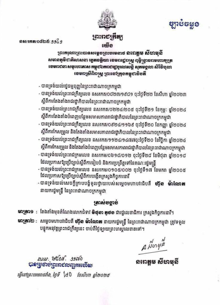 ព្រះរាជក្រឹត្យត្រាស់បង្គាប់តែងតាំងមុខតំណែង លោកជំទាវ មិថុនា ភូថង ជា រដ្ឋលេខាធិការ ក្រសួងកិច្ចការនារី