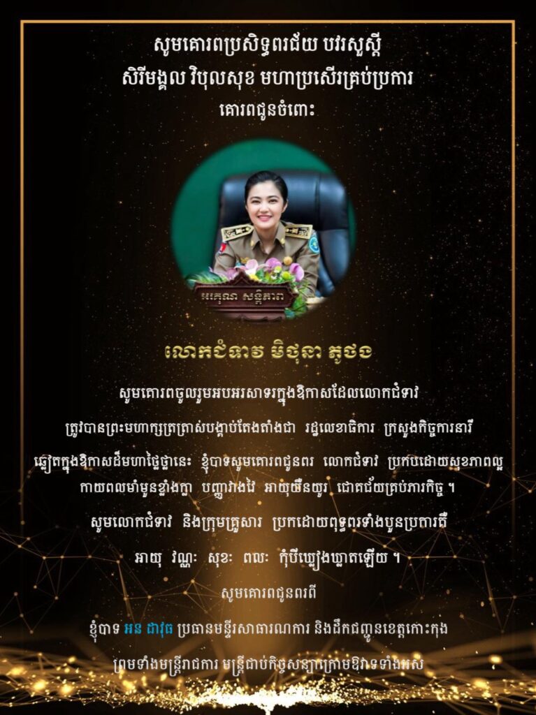 សារលិខិតអបអរសាទរ គោរពជូនចំពោះ លោកជំទាវ មិថុនា ភូថង ពីលោក អន ដាវុធ ប្រធានមន្ទីរសាធារណការ និងដឹកជញ្ជូនខេត្តកោះកុង ព្រមទាំងមន្ត្រីរាជការ មន្ត្រីជាប់កិច្ចសន្យាក្រោមឱវាទទាំងអស់ ក្នុងឱកាសដែលលោកជំទាវត្រូវបានព្រះមហាក្សត្រត្រាស់បង្គាប់តែងតាំងជា រដ្ឋលេខាធិការ ក្រសួងកិច្ចការនារី