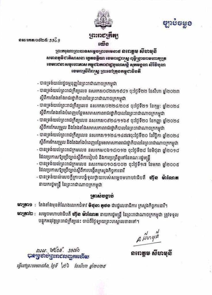 សារលិខិតអបអរសាទរ គោរពជូនចំពោះ លោកជំទាវ មិថុនា ភូថង ពីលោក អន ដាវុធ ប្រធានមន្ទីរសាធារណការ និងដឹកជញ្ជូនខេត្តកោះកុង ព្រមទាំងមន្ត្រីរាជការ មន្ត្រីជាប់កិច្ចសន្យាក្រោមឱវាទទាំងអស់ ក្នុងឱកាសដែលលោកជំទាវត្រូវបានព្រះមហាក្សត្រត្រាស់បង្គាប់តែងតាំងជា រដ្ឋលេខាធិការ ក្រសួងកិច្ចការនារី នៅថ្ងៃទី២០ ខែសីហា ឆ្នាំ២០២៥។