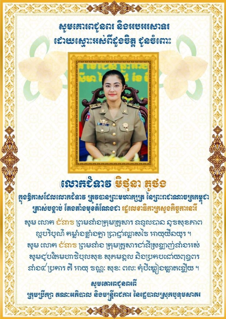 ក្រុមប្រឹក្សាស្រុក គណៈអភិបាលស្រុក មន្ត្រីរាជការ កងកម្លាំងប្រដាប់អាវុធទាំងបីប្រភេទ និងប្រជាពលរដ្ឋក្នុងស្រុកបូទុមសាគរ សូមគោរពជូនពរ លោកជំទាវ មិថុនា ភូថង ក្នុងឱកាសដ៏វិសេសវិសាលដែលលោកជំទាវត្រូវបាន ព្រះមហាក្សត្រ ត្រាស់បង្គាប់តែងតាំងមុខតំណែងជា រដ្ឋលេខាធិការ ក្រសួងកិច្ចការនារី សូមលោកជំទាវទទួលបាននូវសុខភាពល្អបរិបូរណ៍ ប្រាជ្ញាឈ្លាសវៃ និងជោគជ័យគ្រប់ភារកិច្ច