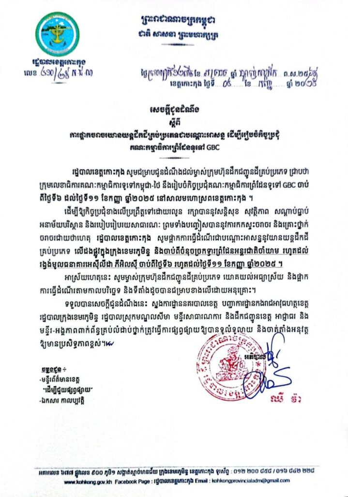 សេចក្តីជូនដំណឹង ស្តីពីការផ្អាកចរាចរយានយន្តដឹកដីគ្រប់ប្រភេទ ជាបណ្តោះអាសន្ន ដើម្បីរៀបចំកិច្ចប្រជុំ គណៈកម្មាធិការព្រំដែនទូទៅ GBC