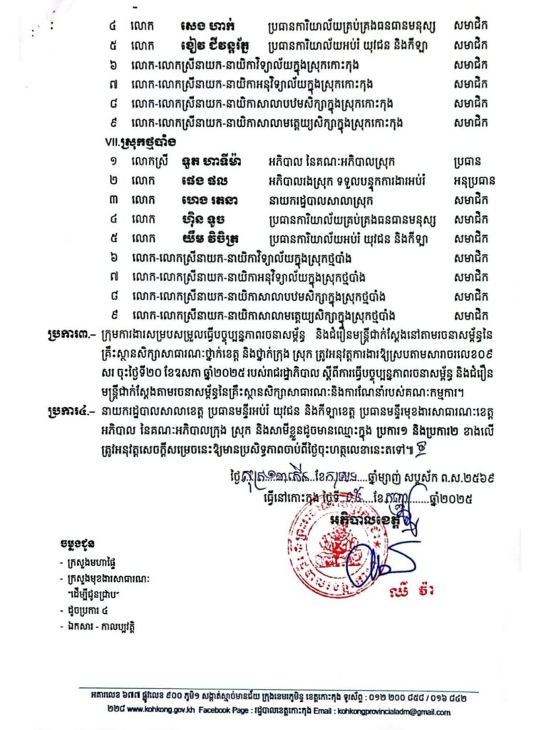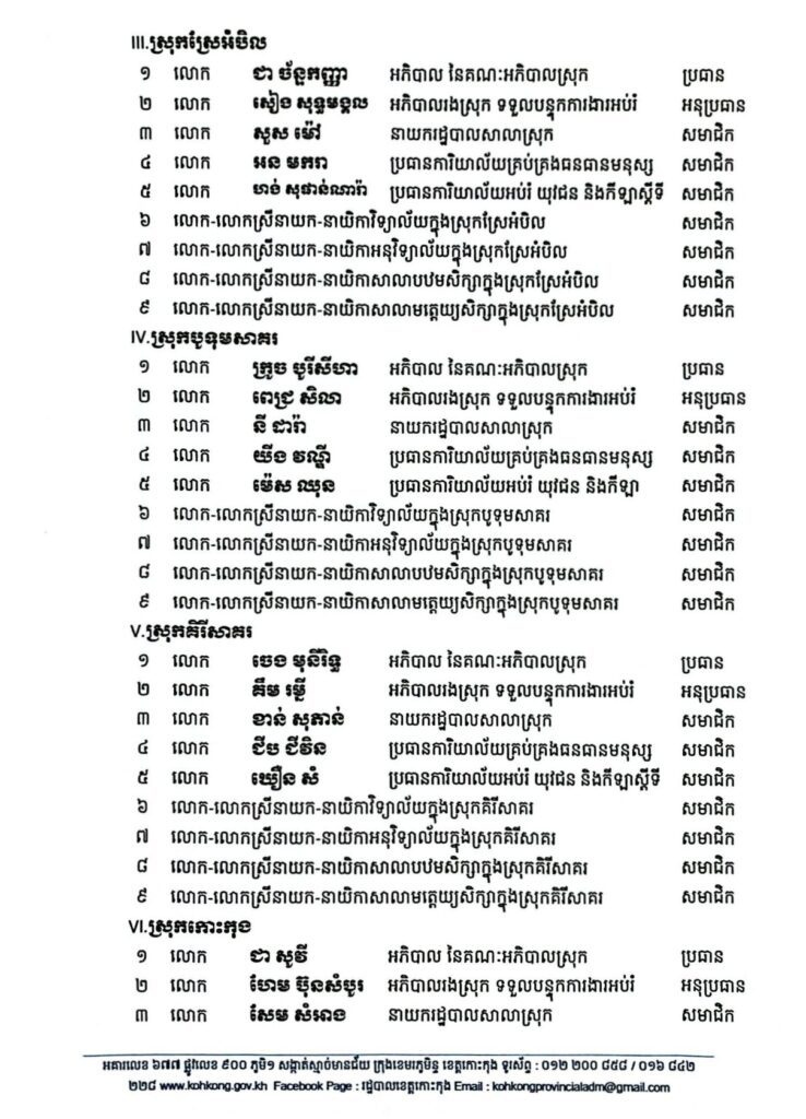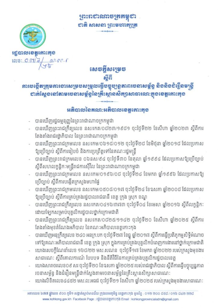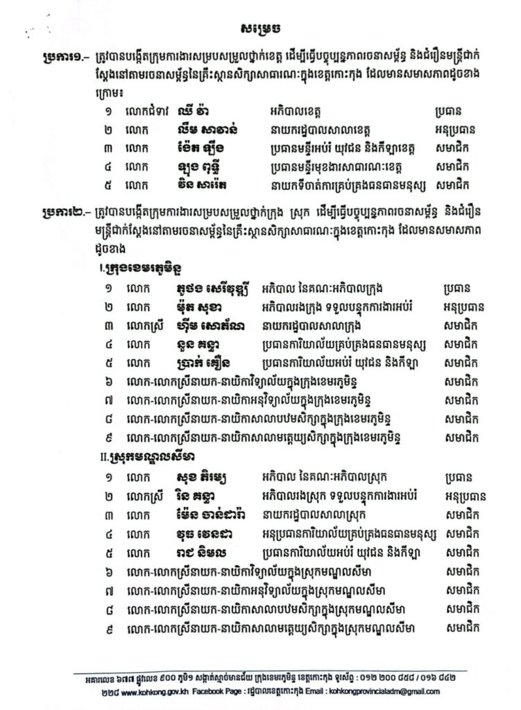 សេចក្តីសម្រេច ស្តីពីការបង្កើតក្រុមការងារសម្របសម្រួលធ្វើបច្ចុប្បន្នភាពរចនាសម្ព័ន្ធ និងជំរឿនមន្ត្រី ជាក់ស្តែងនៅតាមរចនាសម្ព័ន្ធនៃគ្រឹះស្ថានសិក្សាសាធារណៈក្នុងខេត្តកោះកុង