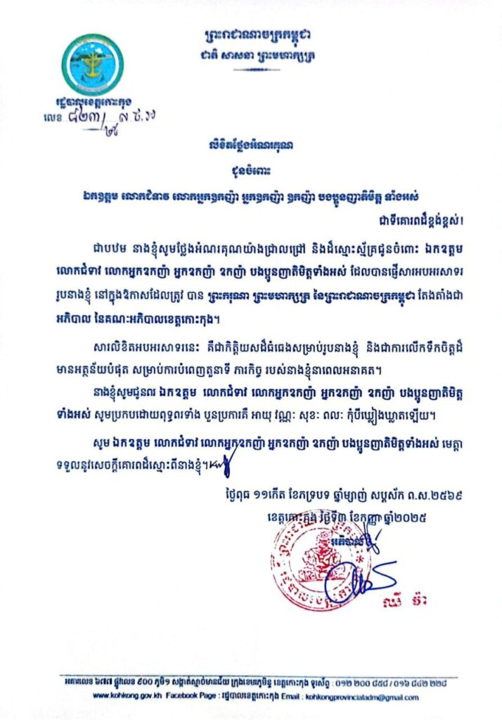 លិខិតថ្លែងអំណរគុណ ជូនចំពោះឯកឧត្តម លោកជំទាវ លោកអ្នកឧកញ៉ា អ្នកឧកញ៉ា ឧកញ៉ា បងប្អូនញាតិមិត្ត
