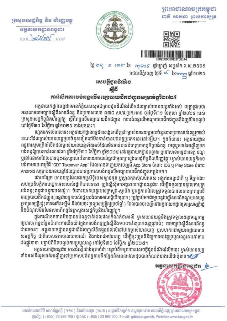 សេចក្តីជូនដំណឹង ស្តីពីការរំលឹកការបង់ពន្ធលើមធ្យោបាយដឹកជញ្ជូនសម្រាប់ឆ្នាំ២០២៥
