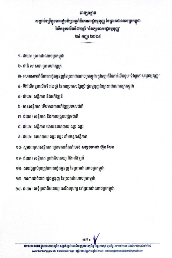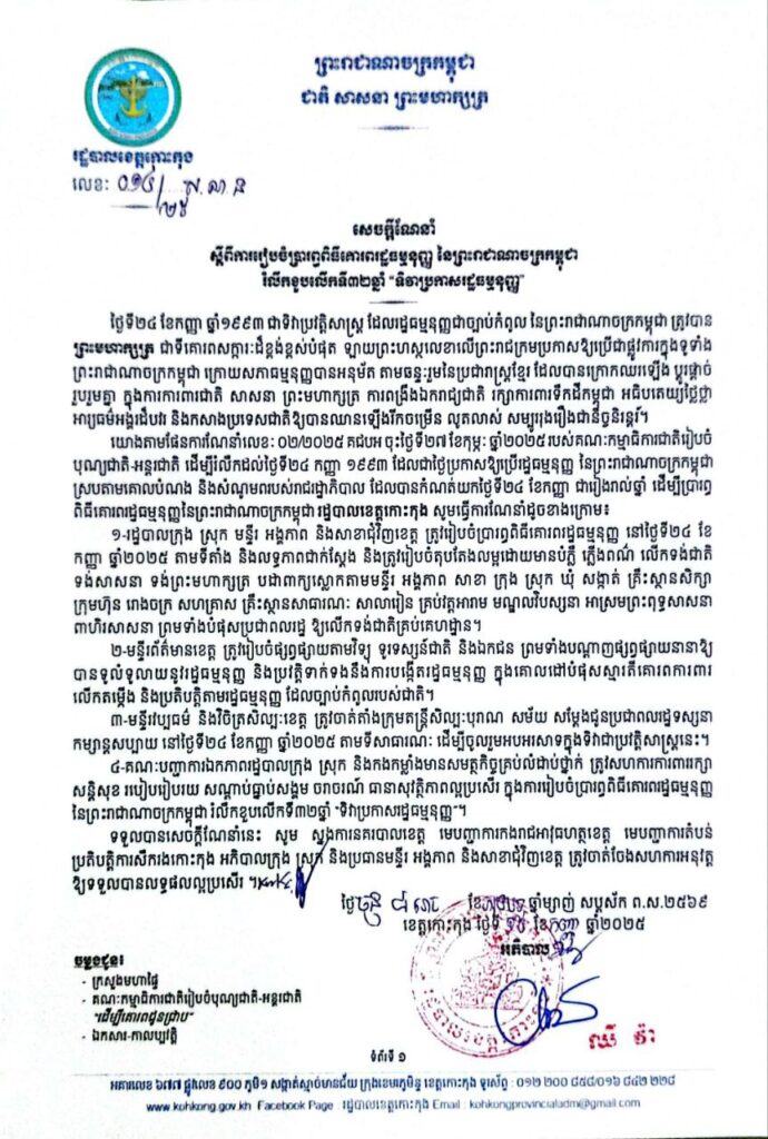សេចក្តីណែនាំ ស្តីពីការរៀបចំប្រារព្ធពិធីគោរពរដ្ឋធម្មនុញ្ញ នៃព្រះរាជាណាចក្រកម្ពុជា រំលឹកខួបលើកទី៣២ឆ្នាំ “ទិវាប្រកាសរដ្ឋធម្មនុញ្ញ”