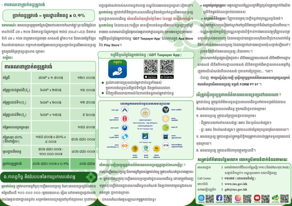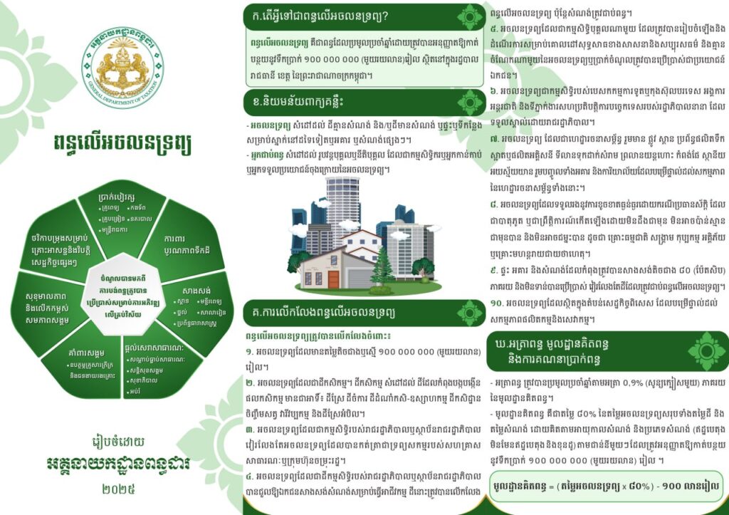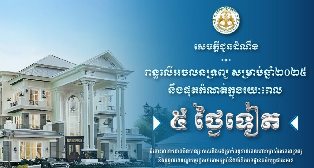 ពន្ធលើអចលនទ្រព្យសម្រាប់ឆ្នាំ២០២៥ នឹងត្រូវផុតកំណត់ត្រឹមថ្ងៃទី៣០ ខែកញ្ញា ឆ្នាំ២០២៥ ខាងមុខនេះ ដូច្នេះម្ចាស់អចលនទ្រព្យ ដែលខកខានមិនបានបំពេញកាតព្វកិច្ចប្រកាសនិងបង់ប្រាក់ពន្ធលើអចលនទ្រព្យបានទាន់ពេលវេលា នឹងត្រូវទទួលរងនូវទណ្ឌកម្មរដ្ឋបាលស្របតាមច្បាប់និងលិខិតបទដ្ឋានគតិយុត្តជាធរមាន