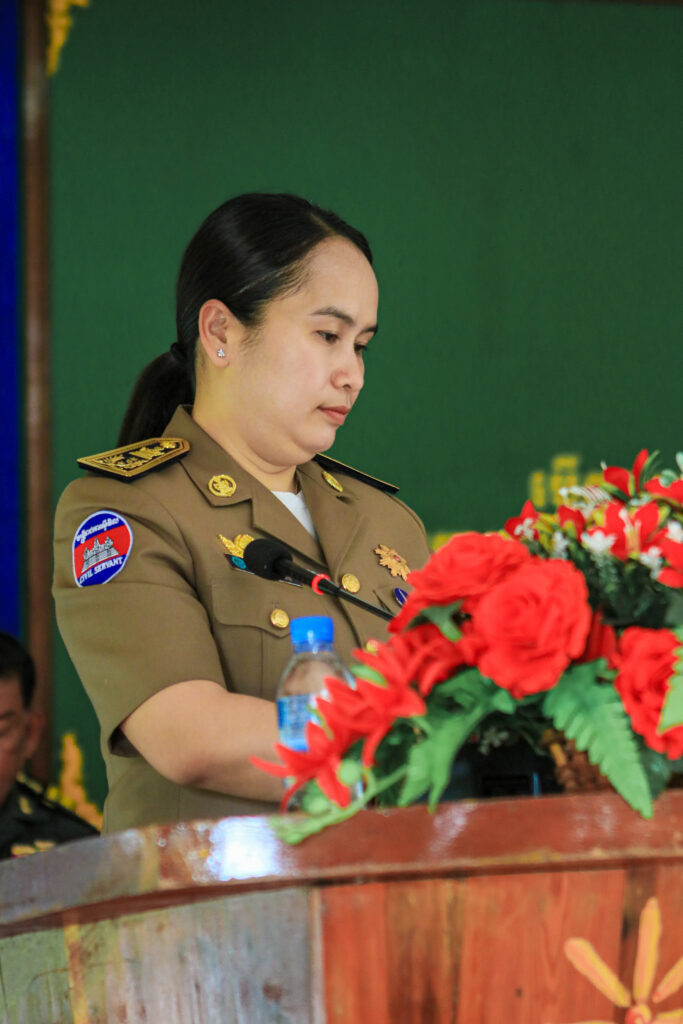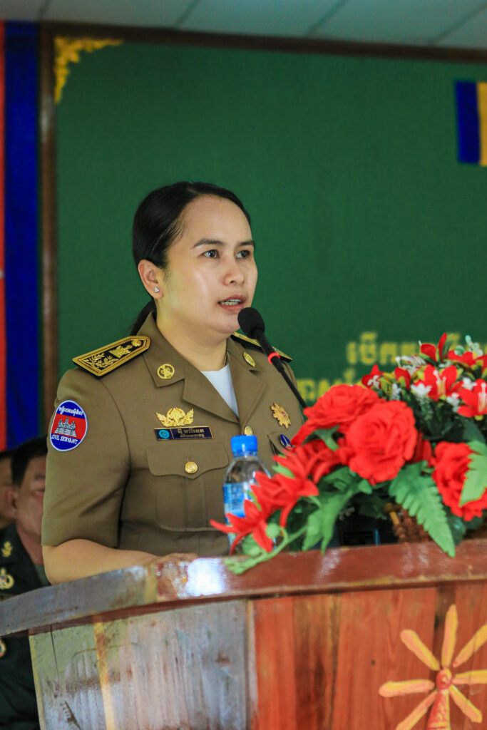 លោកស្រីអភិបាលស្តីទី បានលើកឡើងថា ថ្ងៃនេះតាងនាម លោកជំទាវ ឈី វ៉ា អភិបាល នៃគណៈអភិបាលខេត្ត និងក្នុងនាមនាងខ្ញុំផ្ទាល់ នាងខ្ញុំពិតជាមានសេចក្តីរីករាយ និងសូមស្វាគមន៍ ចំពោះវត្តមានរបស់ ឯកឧត្តម ឧត្តមសេនីយ៍ទោ អ៊ុយ ហៀង មេបញ្ជាការយោធភូមិភាគទី៣ ដែលបានឆ្លៀតពេលវេលា ដ៏មមាញឹក អញ្ជើញចូលរួមជាអធិបតីក្នុង ពិធី « បើកវគ្គហ្វឹកហ្វឺនបំប៉នពង្រឹងសមត្ថភាពយោធា ប្រចាំឆ្នាំ២០២៥ និងប្រកាសតែងតាំងផ្លាស់ប្តូរ មុខតំណែង បំពាក់ឋានន្តរស័ក្តិយោធិន តំបន់ ប្រតិបត្តិការសឹករងកោះកុង» នាឱកាសនេះ។ ក្រោមការដឹកនាំដ៏ឈ្លាសវៃប្រកបដោយគតិបណ្ឌិត និងនយោបាយឈ្នះ ឈ្នះ របស់សម្តេចអគ្គមហាសេនាបតីតេជោ ហ៊ុន សែន ប្រធានព្រឹទ្ធសភា នៃព្រះរាជាណាចក្រកម្ពុជា និងជាអតីតនាយករដ្ឋមន្ត្រី នៃព្រះរាជាណាចក្រកម្ពុជា បានបញ្ចប់ទាំងស្រុងនូវសង្គ្រាមស៊ីវិលនៅកម្ពុជា និងបានធ្វើឱ្យកម្ពុជាទទួលបាននូវសុខសន្តិភាព ស្ថិរភាពពេញលេញ និងមានការអភិវឌ្ឍលើគ្រប់វិស័យ។ ក្រោមម្លប់នៃសុខសន្តិភាព បានអនុញ្ញាតឱ្យប្រទេសជាតិយើងមានលទ្ធភាពគ្រប់យ៉ាងដើម្បីជំរុញការអភិវឌ្ឍលើគ្រប់វិស័យ និងបាននាំមកនូវការផ្លាស់ប្តូរជាប្រវត្តិសាស្ត្រ ដែល ប្រទេសកម្ពុជាពីមុនធ្លាប់ត្រូវបានហែកហួរដោយសង្គ្រាមរ៉ាំរ៉ៃ ជាវាលពិឃាត ជាតំបន់អសន្តិសុខ និងពោរពេញដោយគ្រាប់មីន និងគ្រាប់មិនទាន់ផ្ទុះ បានក្លាយជារដ្ឋអធិបតេយ្យនិងឯករាជ្យដែល មានសន្តិភាពពេញលេញ មានស្ថិរភាពនយោបាយរឹងមាំ និងនីតិរដ្ឋស្របតាមគោលការណ៍នៃ លទ្ធិប្រជាធិបតេយ្យសេរីពហុបក្ស។ រាជរដ្ឋាភិបាលកម្ពុជានីតិកាលទី៧ នៃរដ្ឋសភា ក្រោមការដឹកនាំប្រកបដោយចក្ខុវិស័យ វែងឆ្ងាយរបស់សម្តេចមហាបវធិបតី ហ៊ុន ម៉ាណែត រាជរដ្ឋាភិបាលនៃព្រះរាជាណាចក្រកម្ពុជា សម្រេចបាននូវសមិទ្ធផលធំៗយ៉ាងច្រើនក្នុងការអនុវត្តកម្មវិធីនយោបាយ និងយុទ្ធសាស្ត្របញ្ចកោណ ដំណាក់កាលទី១ របស់ខ្លួនដោយឈរលើគោលជំហរច្បាស់លាស់បោះជំហានទៅមុខ ក្នុងការ អភិវឌ្ឍលើគ្រប់វិស័យ និងការថែរក្សា ការពារសន្តិសុខ និងសុវត្ថិភាពសង្គម។