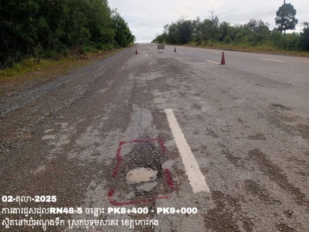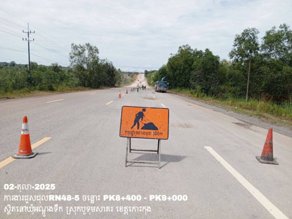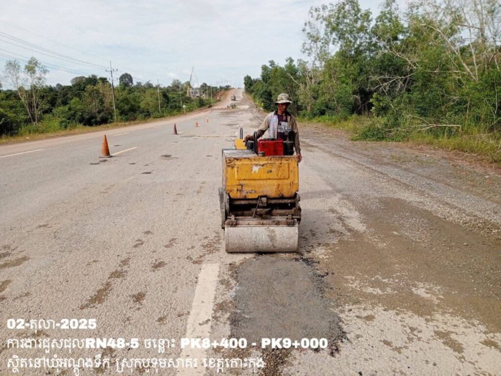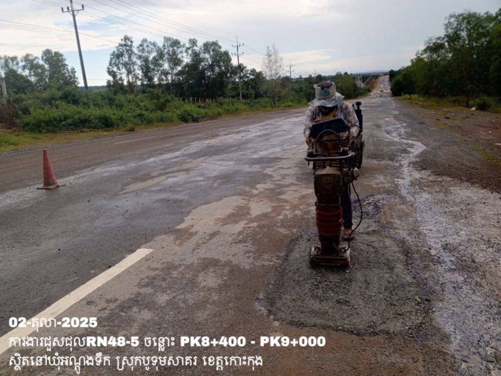 -បន្តការងារថែទាំប្រចាំលើផ្លូវជាតិលេខ 48-5 ឃុំអណ្ដូងទឹក ស្រុកបូទុមសាគរ ខេត្តកោះកុង សកម្មភាពការងារ ជួសជុលសំបុកមាន់ ដោយប្រើល្បាយថ្មម៉ិច ជាមួយស៊ីម៉ង់ត៍ និងកៅស៊ូ CRS-2 ត្រង់ចន្លោះ PK8+400 – PK9+000។