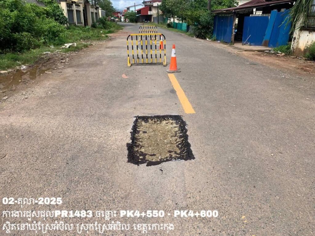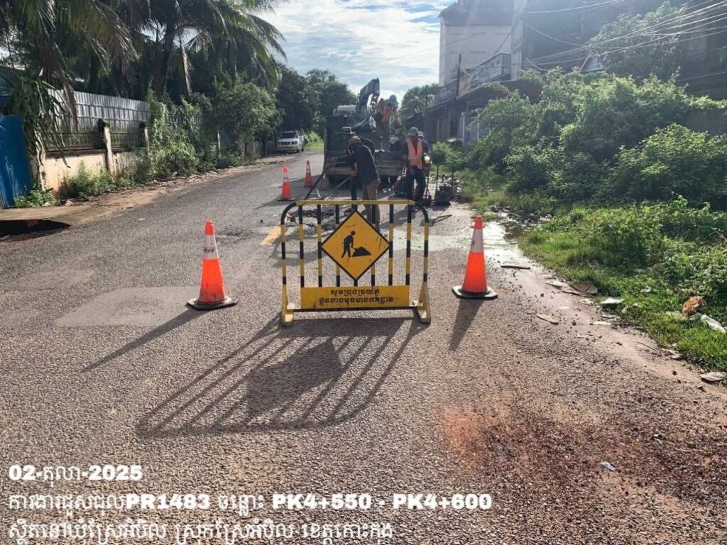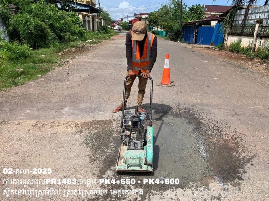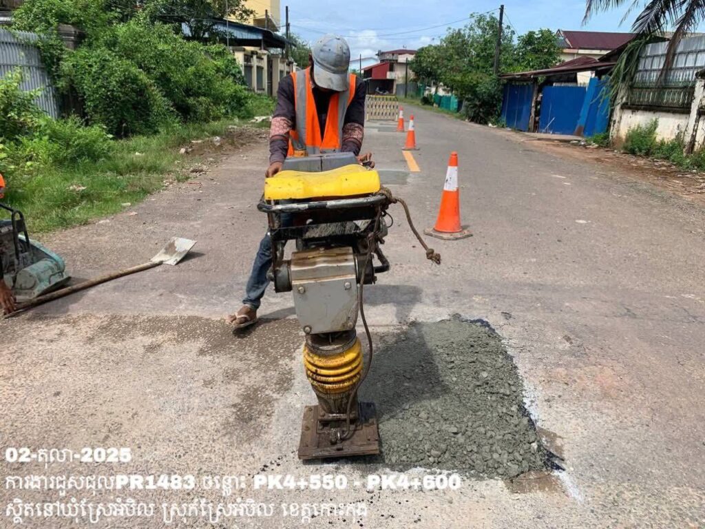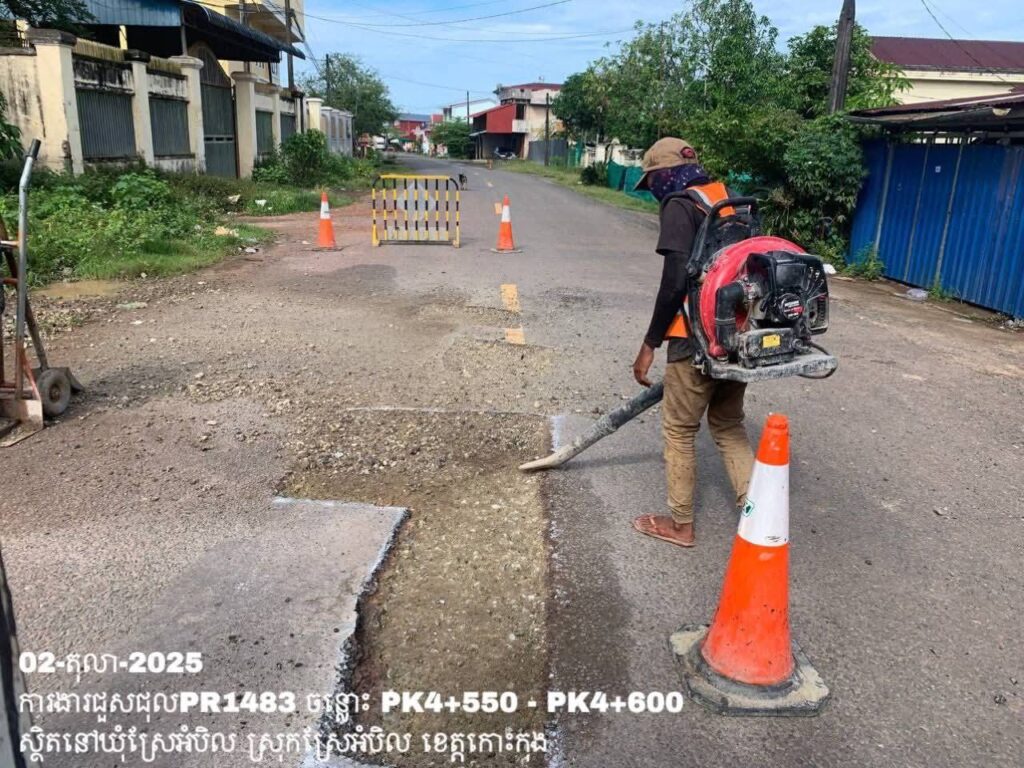 -បន្តការងារថែទាំប្រចាំលើផ្លូវខេត្តលេខ 1483 ឃុំស្រែអំបិល ស្រុកស្រែអំបិល ខេត្តកោះកុង សកម្មភាពការងារ ជួសជុលសំបុកមាន់ ដោយប្រើល្បាយថ្មម៉ិច ជាមួយស៊ីម៉ង់ត៍ និងកៅស៊ូ CRS-2 ត្រង់ចន្លោះ PK4+550 – PK4+600។