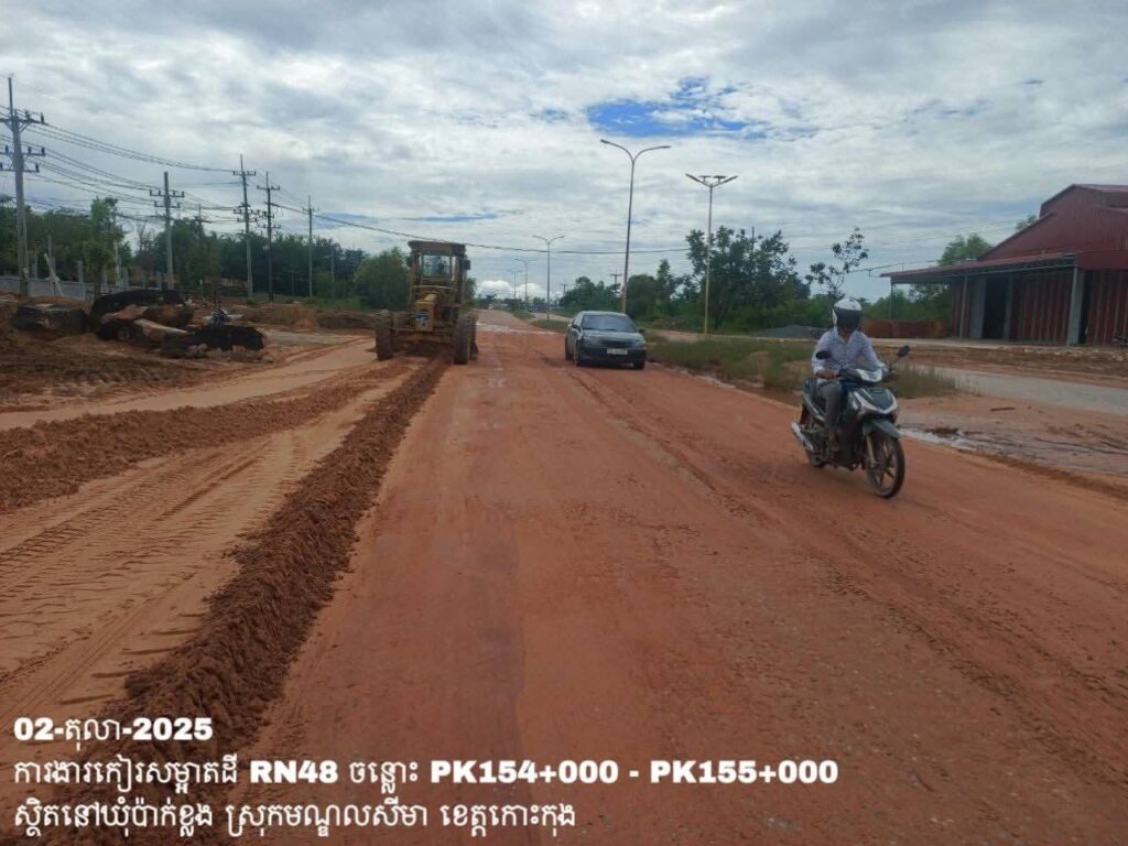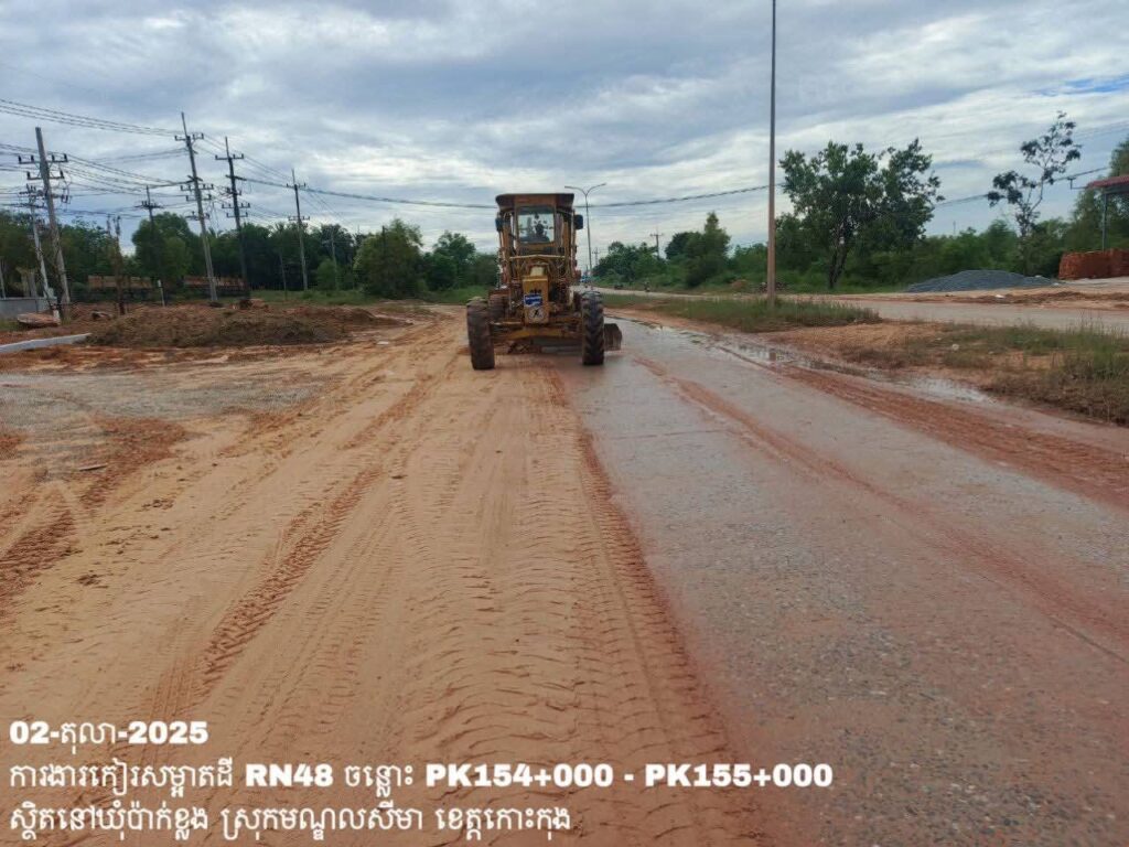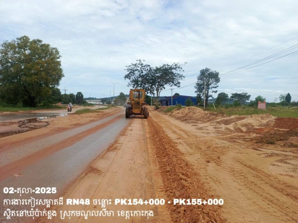 -បន្តការងារថែទាំប្រចាំលើផ្លូវជាតិលេខ 48 ឃុំប៉ាក់ខ្លង ស្រុកមណ្ឌលសីមា ខេត្តកោះកុង សកម្មភាពការងារ កៀរសម្អាតដីចេញពីទ្រូងផ្លូវ ត្រង់ចន្លោះ PK154+000 – PK155+000។
