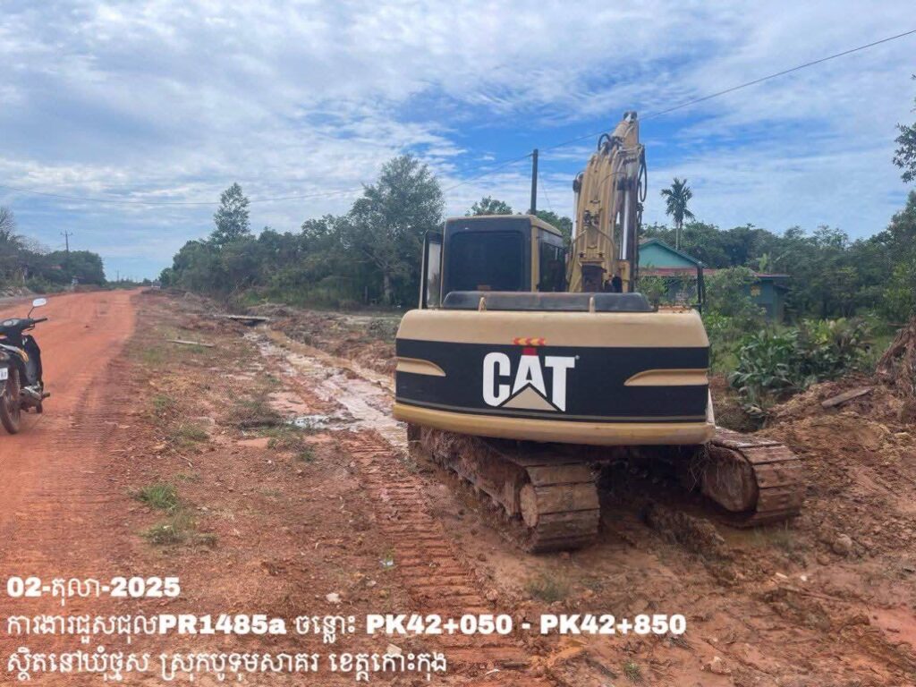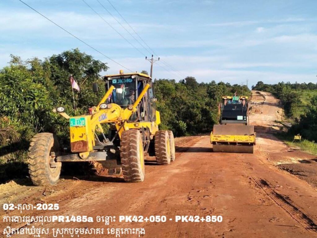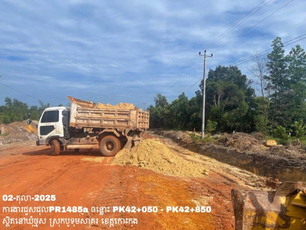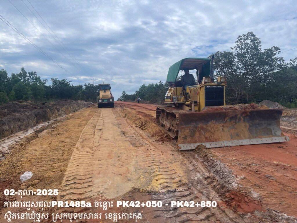 -បន្តការងារថែទាំខួបលើផ្លូវខេត្តលេខ 1485a ឃុំថ្មស ស្រុកបូទុមសាគរ ខេត្តកោះកុង សកម្មភាពការងារ ចាក់ដីរួចកៀរកិនបង្ហាប់ និងកាយកាយប្រឡាយរំដោះទឹក ត្រង់ចន្លោះ PK42+050 – PK42+850។