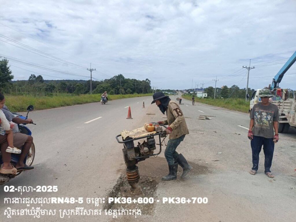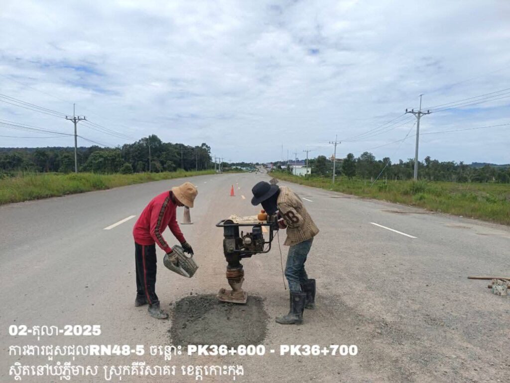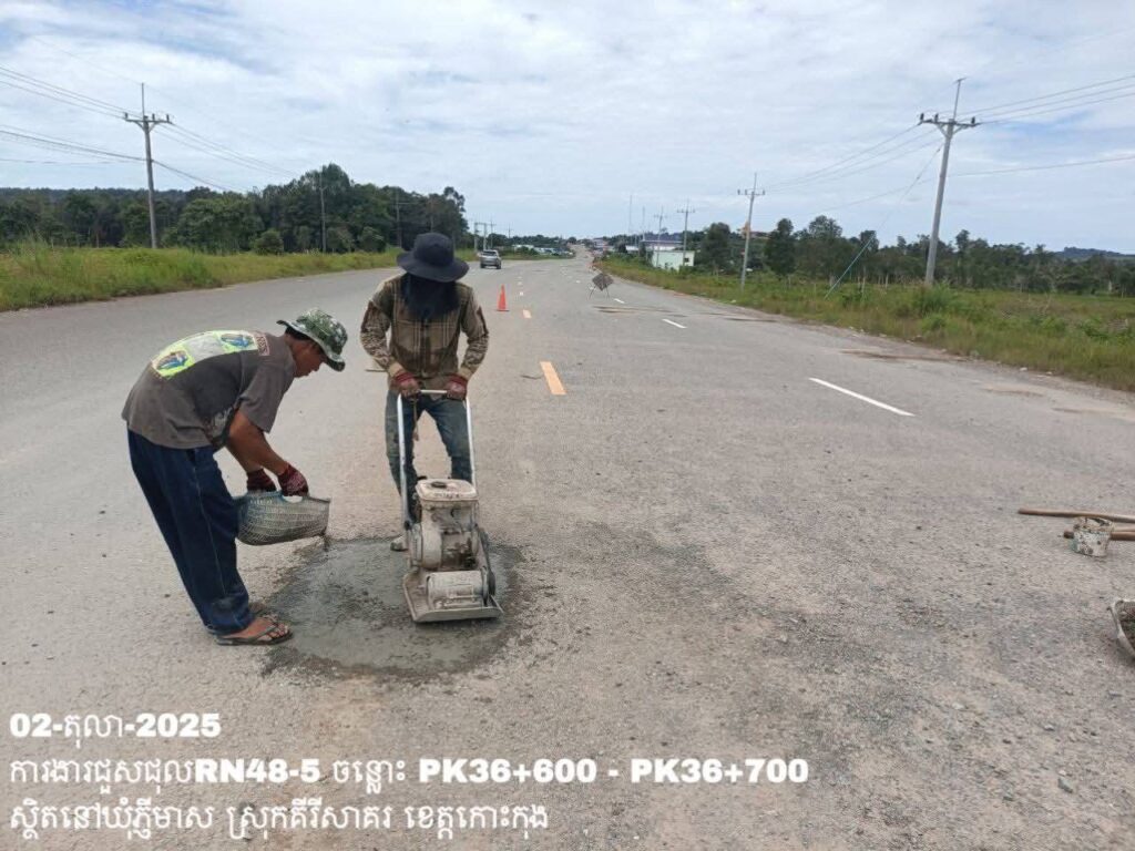 -បន្តការងារថែទាំប្រចាំលើផ្លូវជាតិលេខ 48-5 ឃុំភ្ញីមាស ស្រុកគីរីសាគរ ខេត្តកោះកុង សកម្មភាពការងារ ជួសជុលសំបុកមាន់ ដោយប្រើល្បាយថ្មម៉ិច ជាមួយស៊ីម៉ង់ត៍ និងកៅស៊ូ CRS-2 ត្រង់ចន្លោះ PK36+600 – PK36+700។