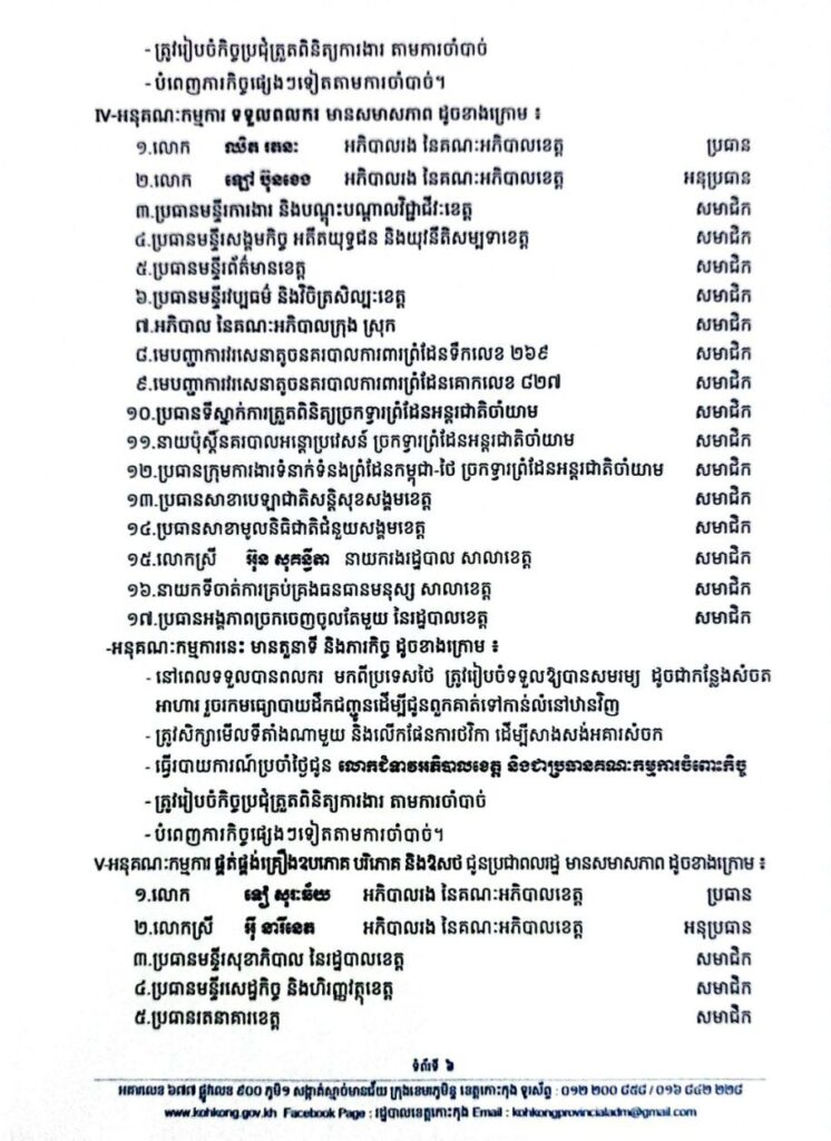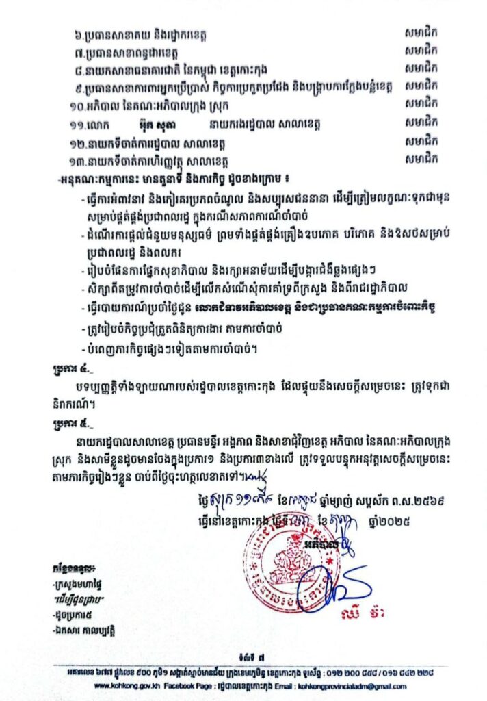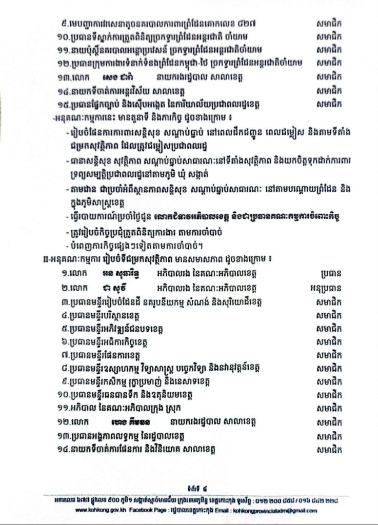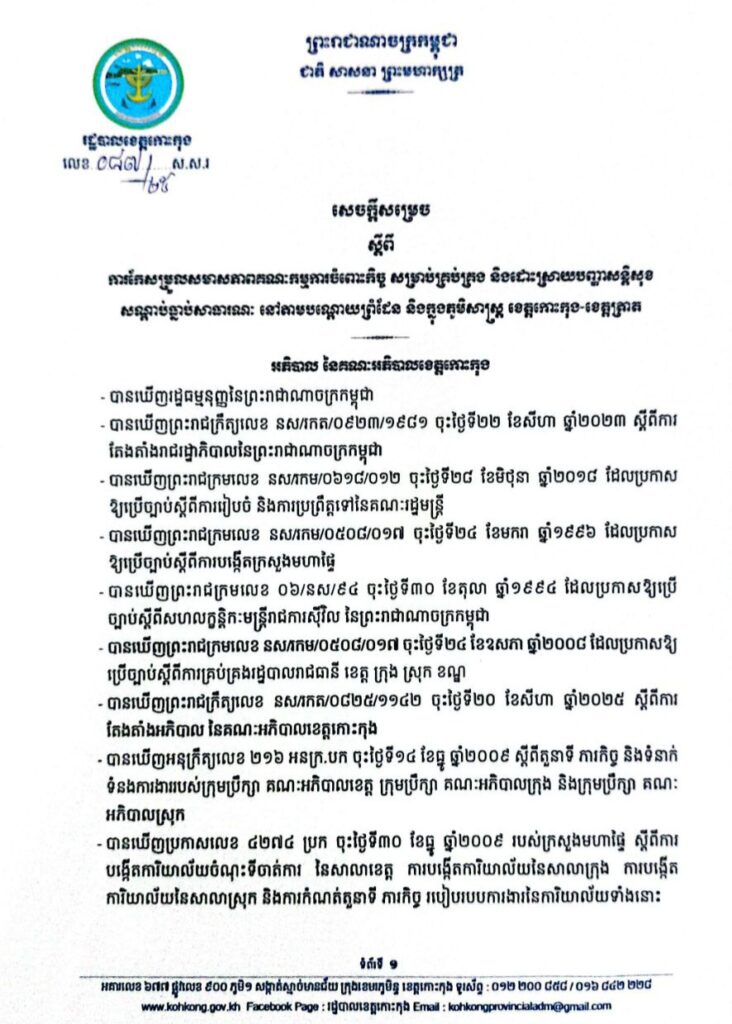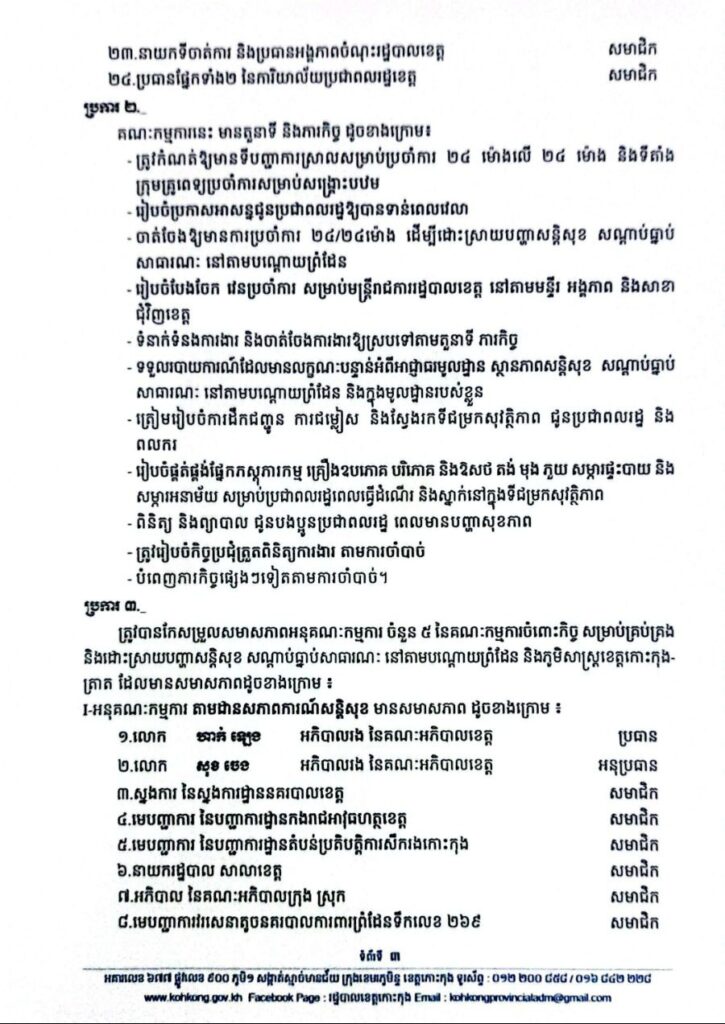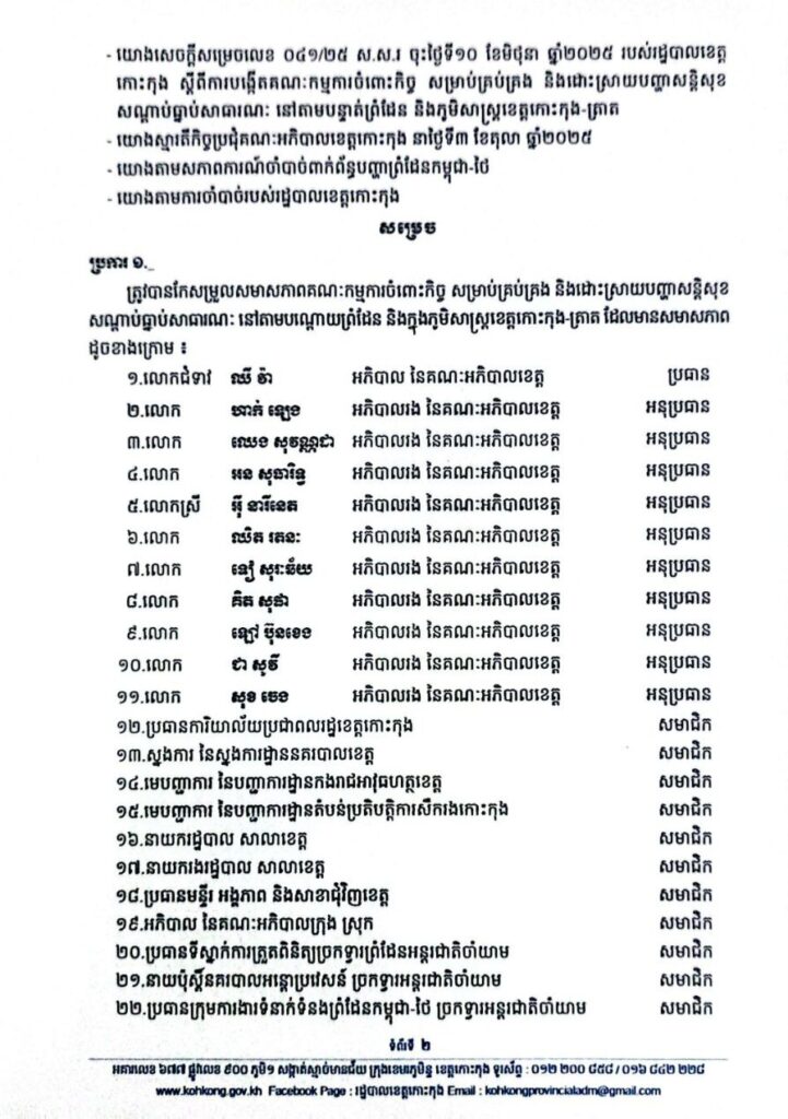សេចក្តីសម្រេច ស្តីពីការកែសម្រួលសមាសភាពគណៈកម្មការចំពោះកិច្ច សម្រាប់គ្រប់គ្រង និងដោះស្រាយបញ្ហាសន្តិសុខ សណ្តាប់ធ្នាប់សាធារណៈ នៅតាមបណ្តោយព្រំដែន និងក្នុងភូមិសាស្ត្រ ខេត្តកោះកុង-ខេត្តត្រាត