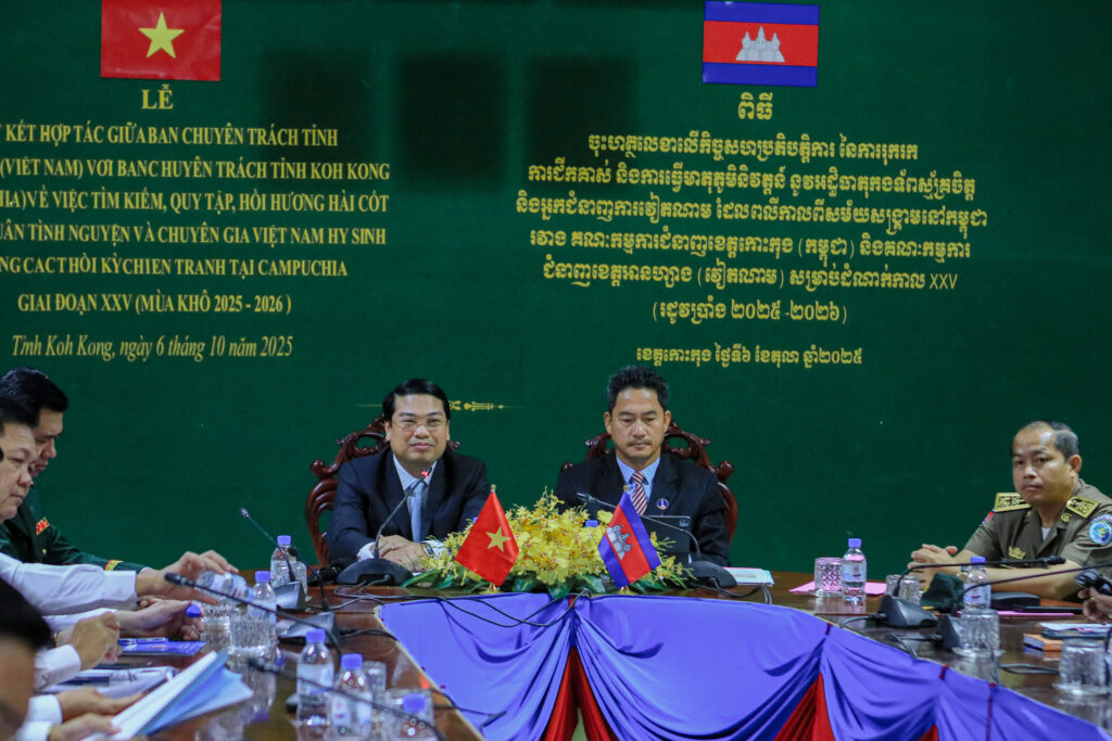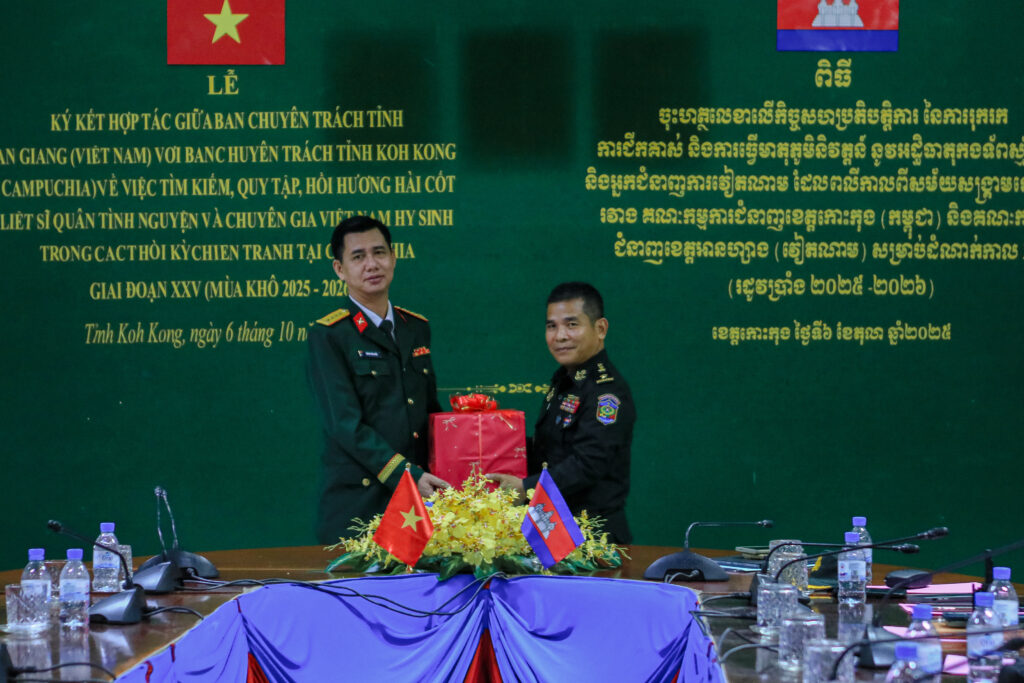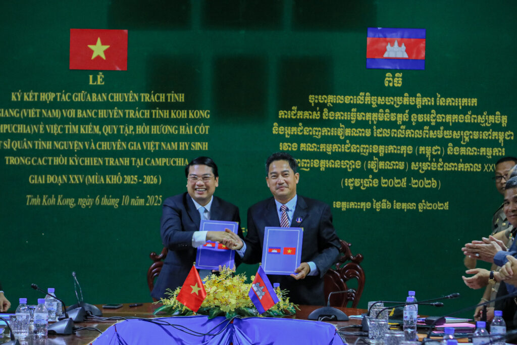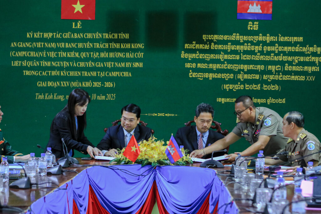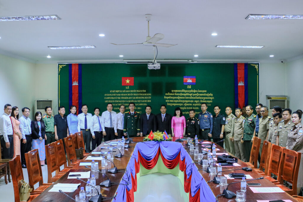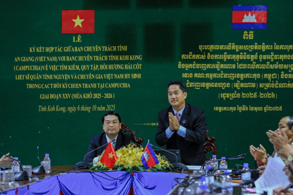 លោក ហាក់ ឡេង អភិបាលស្តីទីខេត្តកោះកុង បានអញ្ជើញ ចុះហត្ថលេខាលើកំណត់ហេតុកិច្ចសហប្រតិបត្តិការ នៃការរុករក ការជីកគាស់ និងការធ្វើមាតុភូមិនិវត្តន៍នូវអដ្ឋិធាតុកងទ័ពស្ម័គ្រចិត្ត និងអ្នកជំនាញការវៀតណាម ដែលបានពលីកាលពីសម័យសង្រ្គាមនៅកម្ពុជា ក្នុងភូមិសាស្រ្តខេត្តកោះកុង រវាងគណៈកម្មការជំនាញខេត្តកោះកុង និងគណៈកម្មការជំនាញខេត្តអានហ្សាង នៃសាធារណរដ្ឋសង្គមនិយមវៀតណាម
