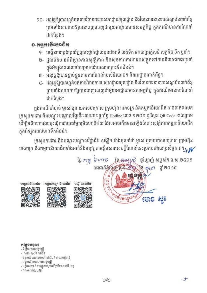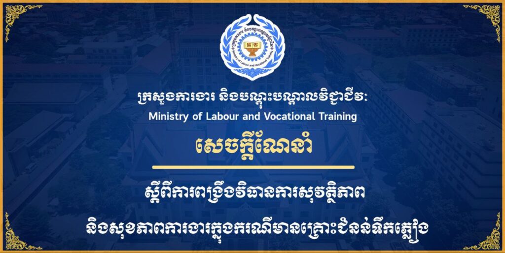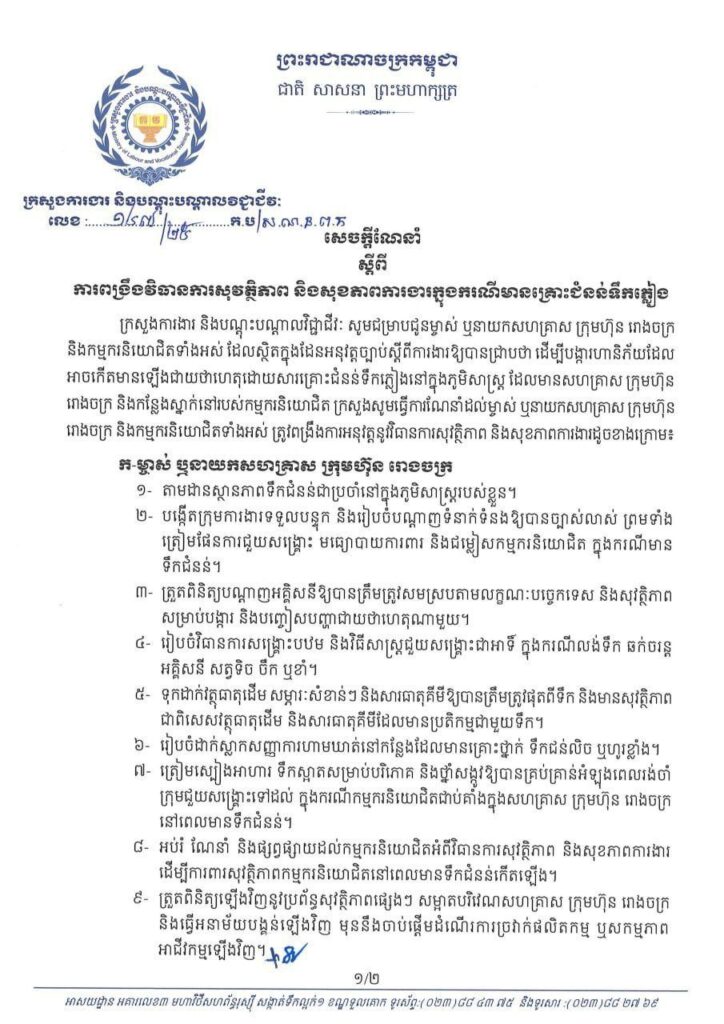 សេចក្តីណែនាំ ស្តីពីការពង្រឹងវិធានការសុវត្ថិភាព និងសុខភាពការងារក្នុងករណីមានគ្រោះជំនន់ទឹកភ្លៀង