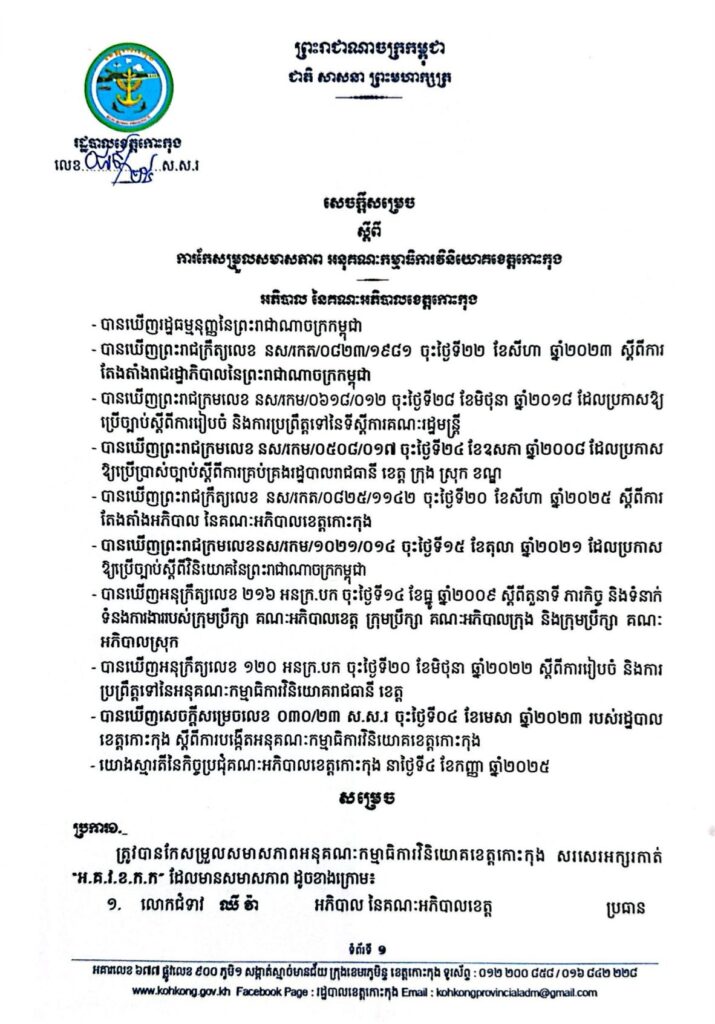 សេចក្តីសម្រេច ស្តីពីការកែសម្រួលសមាសភាពគណៈកម្មាធិការប្រជាជន និងអភិវឌ្ឍន៍ខេត្តកោះកុង