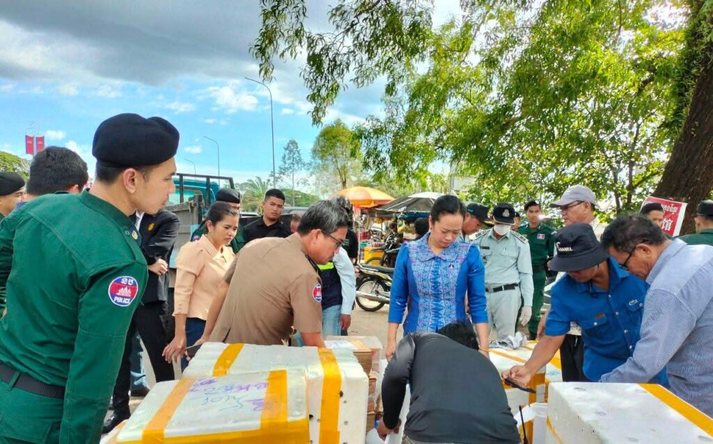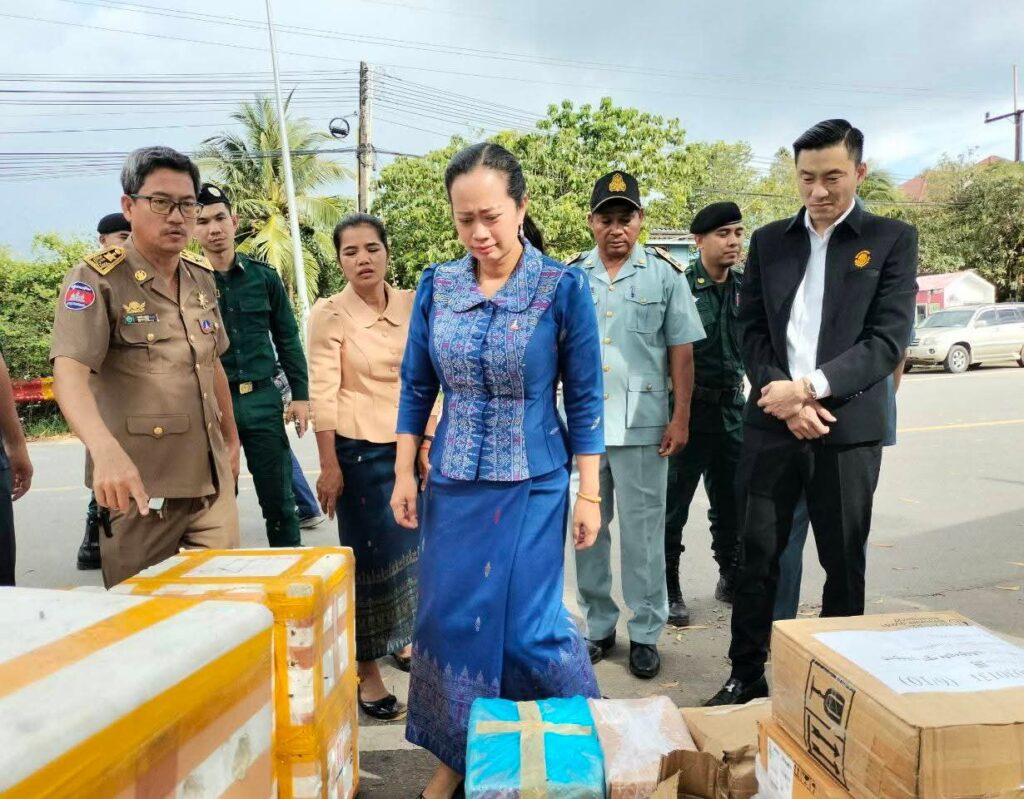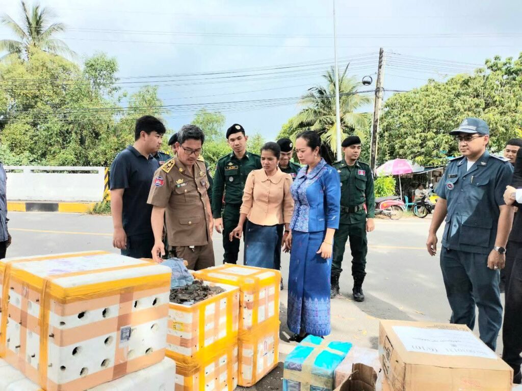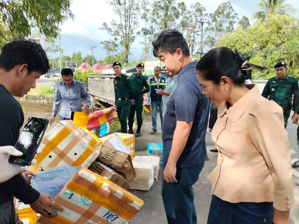 លោកជំទាវ ឈី វ៉ា អភិបាល នៃគណៈអភិបាលខេត្តកោះកុង បានអញ្ជើញចុះពិនិត្យទូកដឹកទំនិញនាំចូលទំនិញពីប្រទេសថៃ ដែលសមត្ថកិច្ចជំនាញបង្ក្រាប និងអនុវត្តនីតិវវិធីច្បាប់ជាធរមាន នៅចំណុចឆ្នេរខ្សាច់ពាមក្រសោប ក្នុងស្រុកមណ្ឌលសីមា។