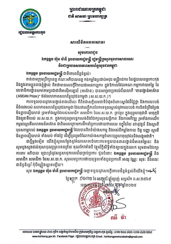 សារលិខិតអបអរសាទរសូមគោរពជូន ឯកឧត្តម ហ៊ុន ម៉ានី ឧបនាយករដ្ឋមន្ត្រី រដ្ឋមន្ត្រីក្រសួងមុខងារសាធារណៈ និងជាប្រធានសហភាពសហព័ន្ធយុវជនកម្ពុជា ក្នុងឱកាសដែលគណៈកម្មការវាយតម្លៃ នៃលេខាធិការដ្ឋានសមាគមប្រជាជាតិអាស៊ីអាគ្នេយ៍(អាស៊ាន) បានសម្រេចប្រគល់ជ័យលាភី “ពានរង្វាន់អាស៊ាន (ASEAN Prize)” ដល់សហភាពសហព័ន្ធយុវជនកម្ពុជា (ស.ស.យ.ក.)