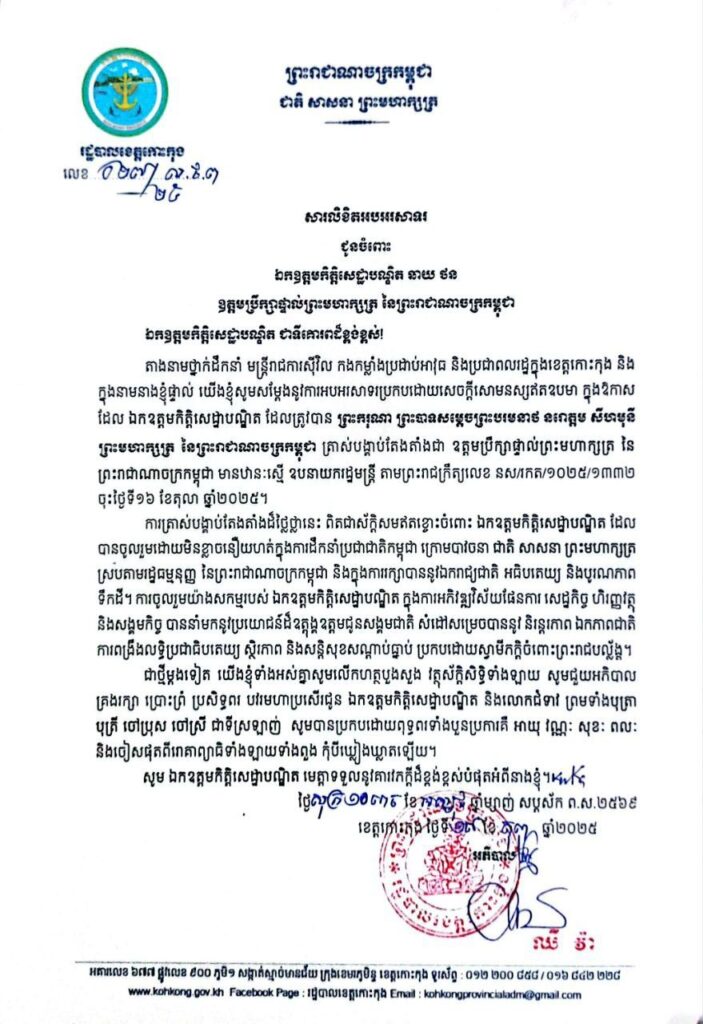 សារលិខិតអបអរសាទរ ជូនចំពោះឯកឧត្តមកិត្តិសេដ្ឋាបណ្ឌិត ឆាយ ថន ឧត្តមប្រឹក្សាផ្ទាល់ព្រះមហាក្សត្រ នៃព្រះរាជាណាចក្រកម្ពុជា