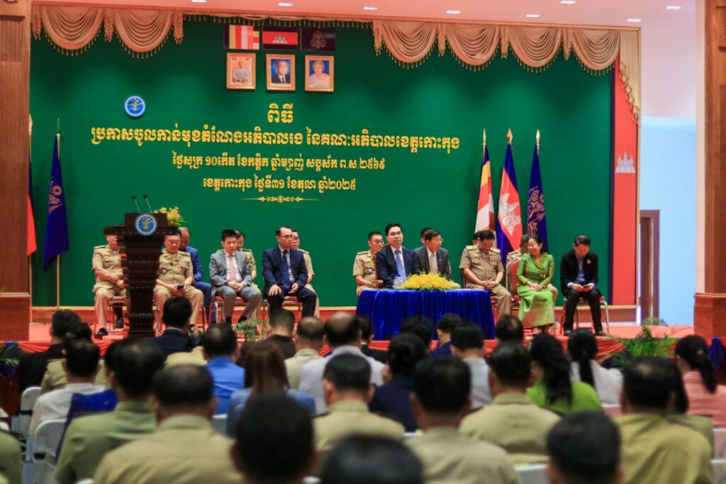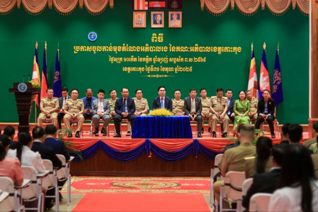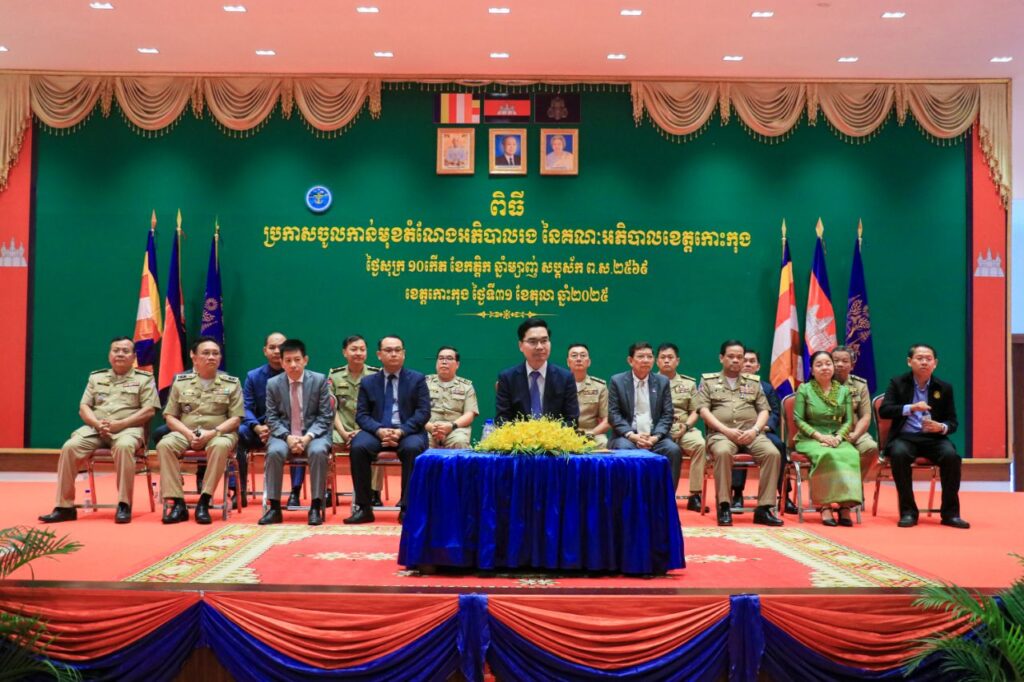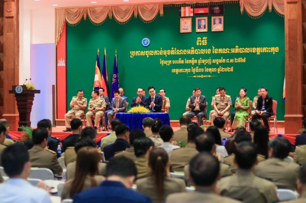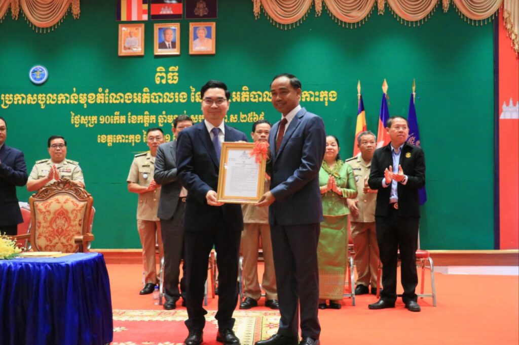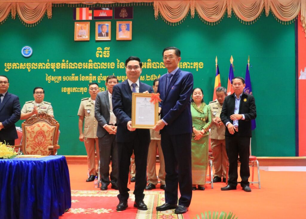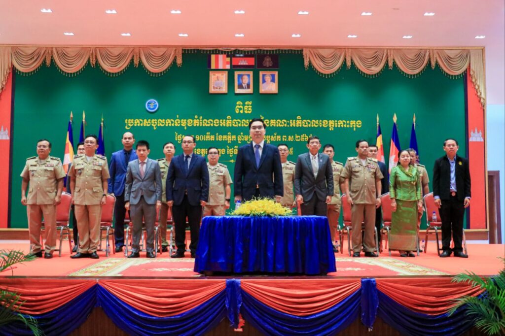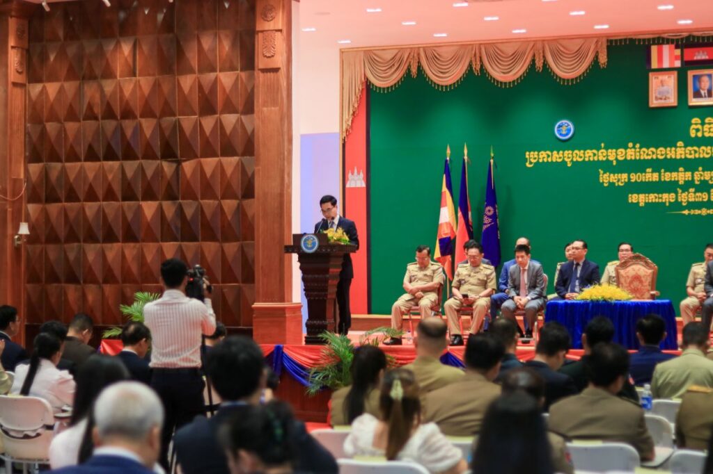 លោក ទៀ សុរឆ័យ អភិបាលស្តីទី នៃគណៈអភិបាលខេត្តកោះកុង បានអញ្ជើញស្វាគមន៍ឯកឧត្តម ប៊ុន ហុន រដ្ឋលេខាធិការក្រសួងមហាផ្ទៃ តំណាងដ៏ខ្ពង់ខ្ពស់ ឯកឧត្តមអភិសន្តិបណ្ឌិត ស សុខា ឧបនាយករដ្ឋមន្ត្រី រដ្ឋមន្ត្រីក្រសួងមហាផ្ទៃ ក្នុងពិធី «ប្រកាសចូលកាន់មុខតំណែងអភិបាលរង នៃគណៈអភិបាលខេត្តកោះកុង»